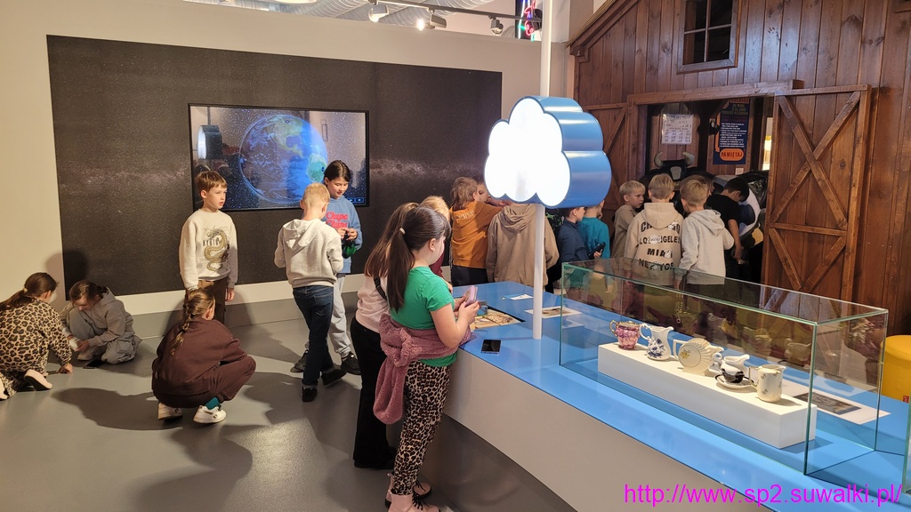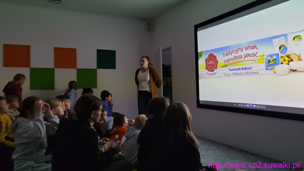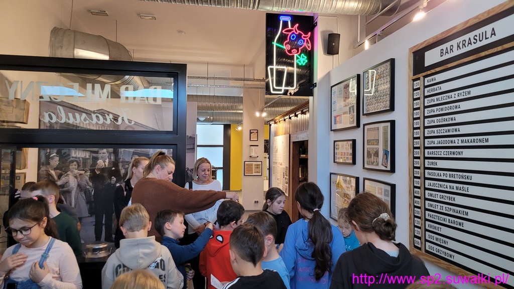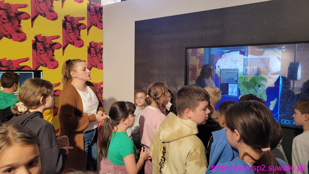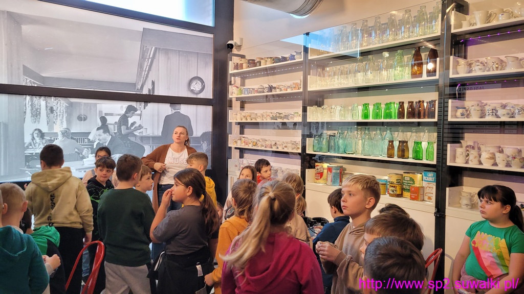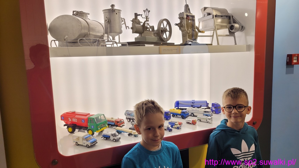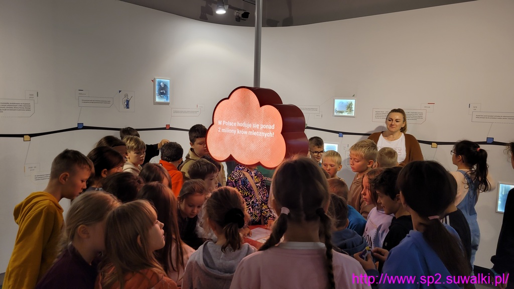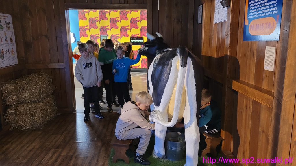 Kolejnym punktem programu było zwiedzanie z przewodnikiem multimedialnej wystawy w Muzeum Mleka. Dzieci poznały tam zwierzęta hodowlane oraz posłuchały ciekawostek na temat historii picia mleka i jego przetworów. Następnie każdy mógł sprawdzić swoje umiejętności w ręcznym dojeniu krowy. Uczniowie mieli też okazję prześledzić drogę, jaką odbywa mleko od rolnika do odbiorcy oraz sprawdzić, jak dawniej wyglądały bardzo popularne bary mleczne. Wizytę w tym atrakcyjnym muzeum zakończyły zdjęcia z Krówką Matyldą oraz zakup pamiątkowych gadżetów.