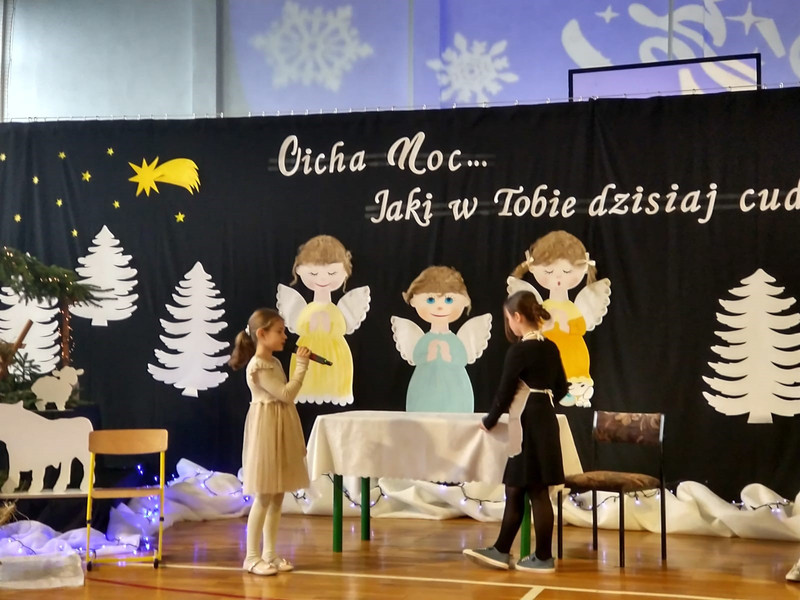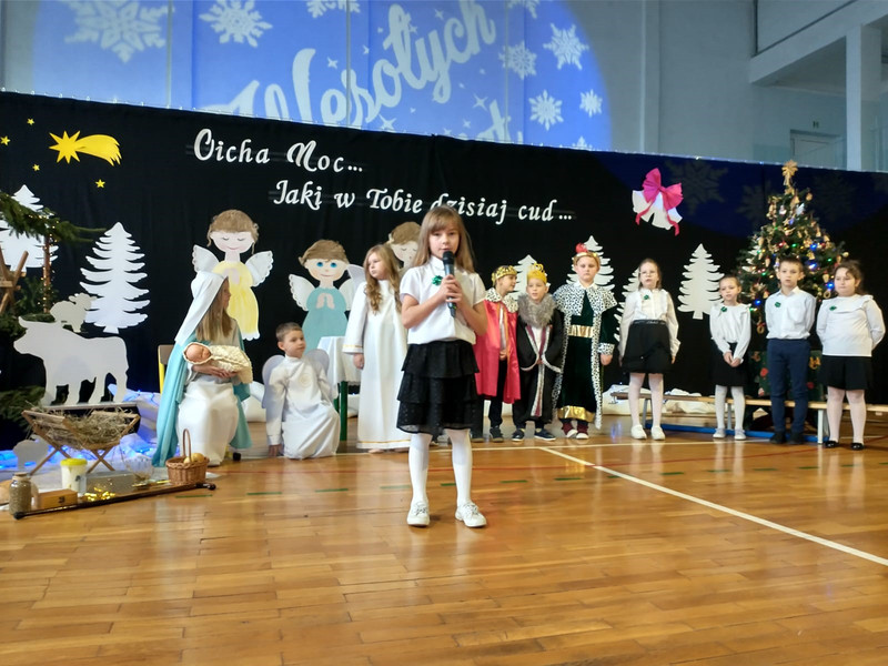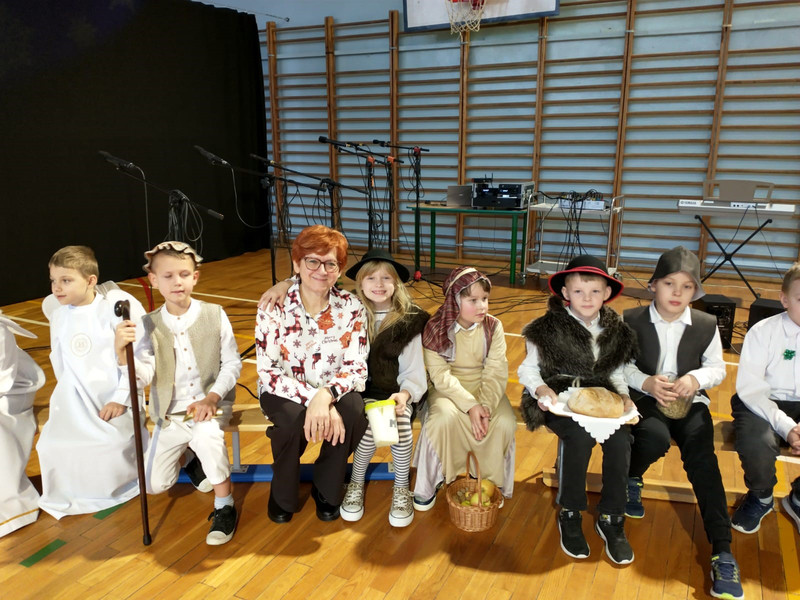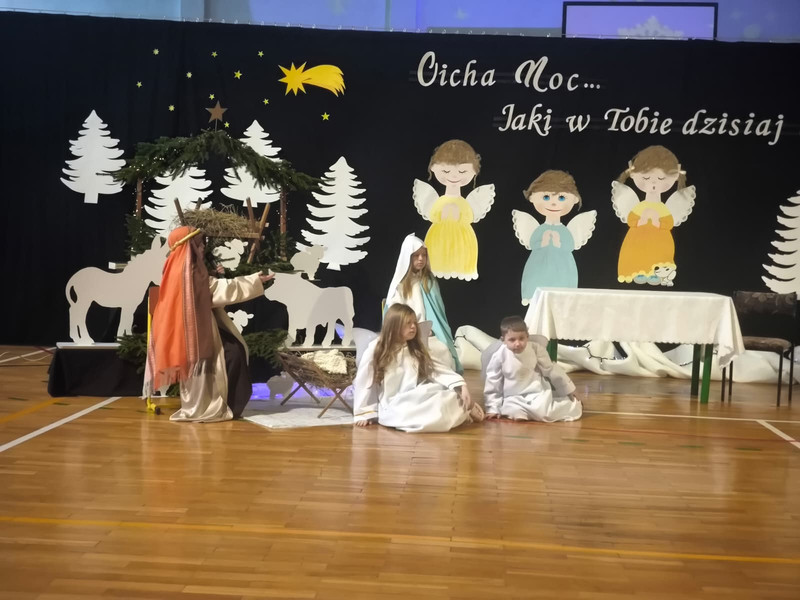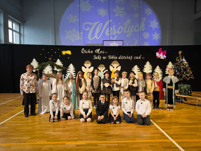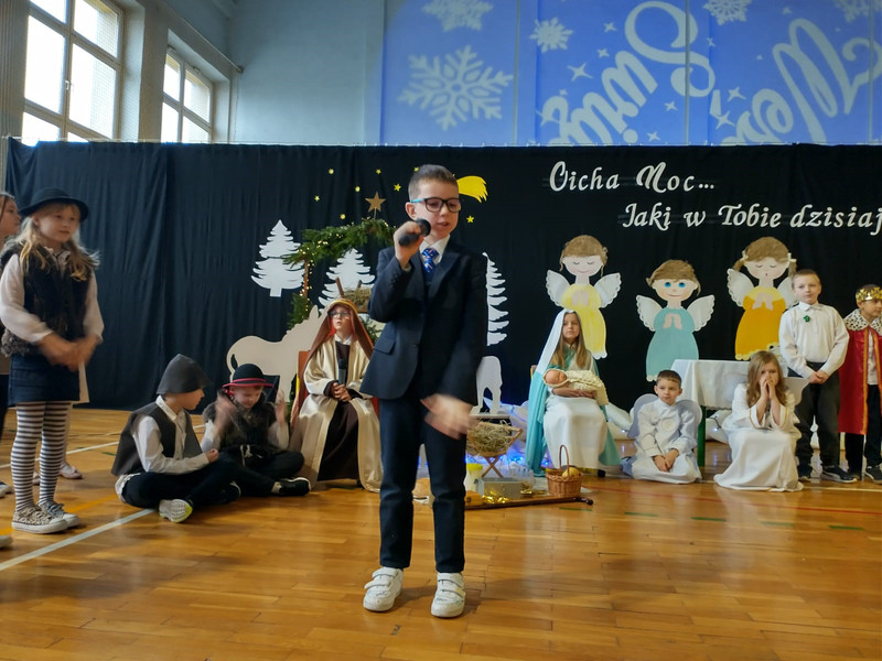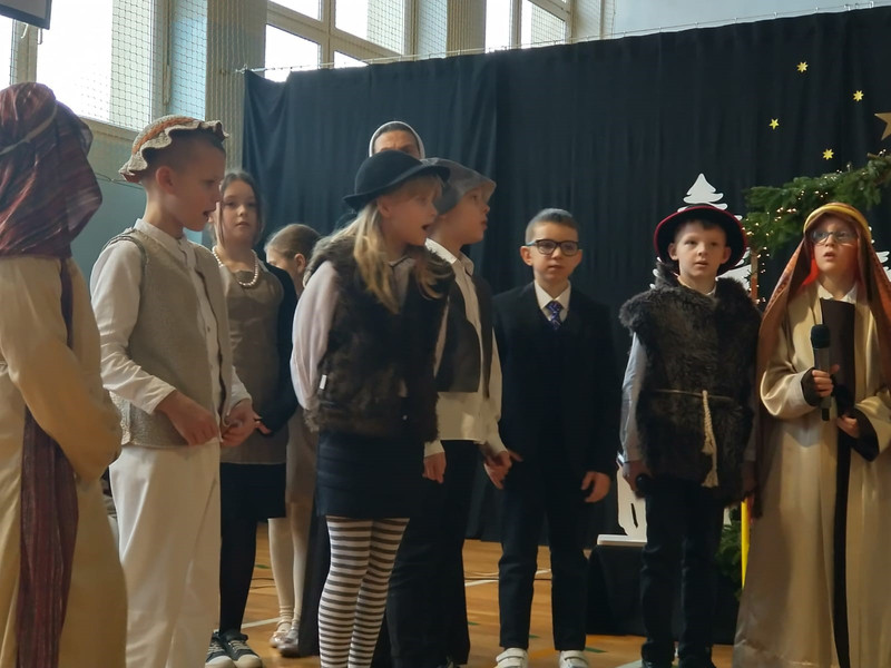 W drugiej części jasełek, tym razem skierowanej do starszych uczniów, wybrzmiały fragmenty Pisma Świętego, które przypomniały o istocie Bożego Narodzenia. Całość dopełniły pięknie wykonane kolędy, wyśpiewane przez solistów i zespół muzyczny pod kierunkiem pani Anny Czapli. Występy starszych uczniów, przygotowanych przez panią Joannę Smykowską, zachwyciły dojrzałością interpretacji i stworzyły atmosferę skupienia oraz wspólnoty.