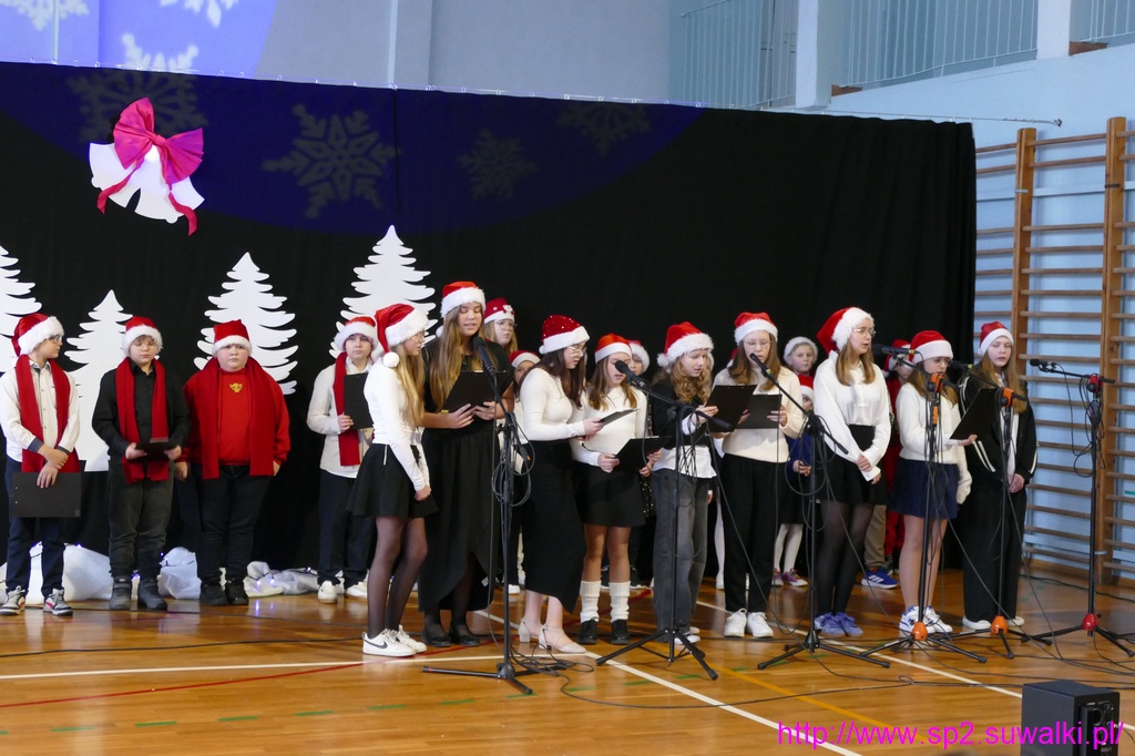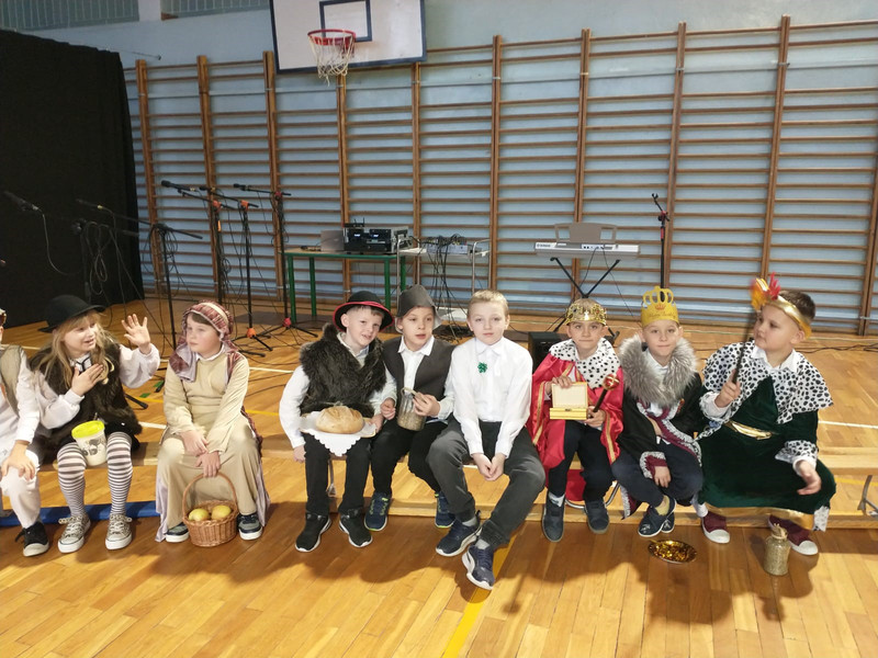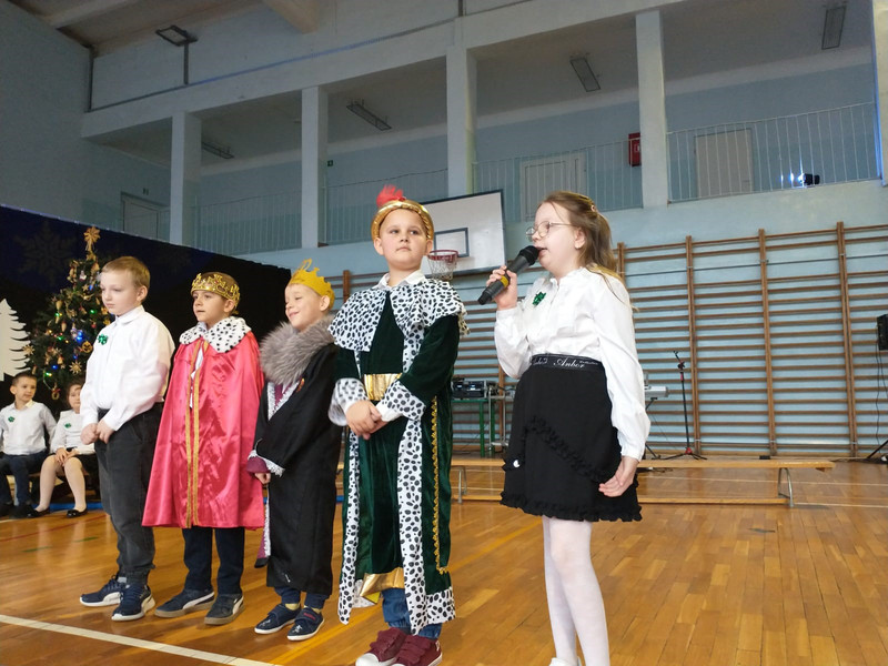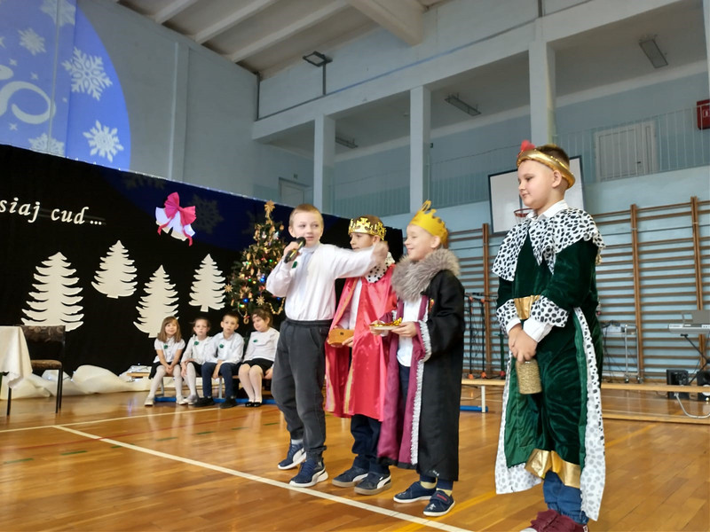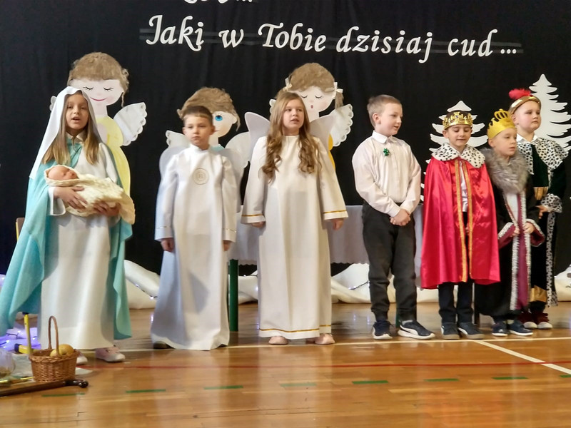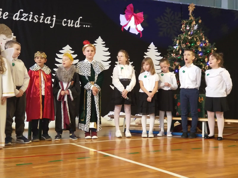 W drugiej części jasełek, tym razem skierowanej do starszych uczniów, wybrzmiały fragmenty Pisma Świętego, które przypomniały o istocie Bożego Narodzenia. Całość dopełniły pięknie wykonane kolędy, wyśpiewane przez solistów i zespół muzyczny pod kierunkiem pani Anny Czapli. Występy starszych uczniów, przygotowanych przez panią Joannę Smykowską, zachwyciły dojrzałością interpretacji i stworzyły atmosferę skupienia oraz wspólnoty.