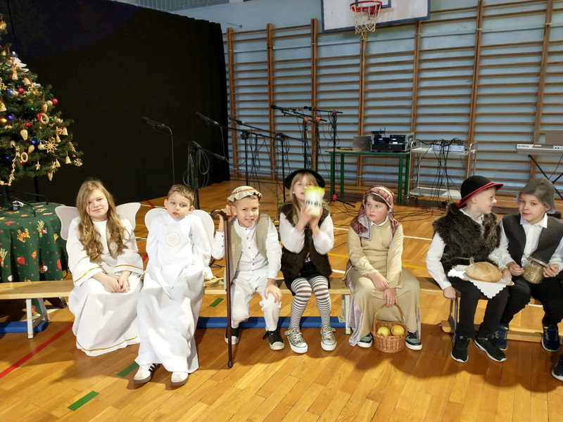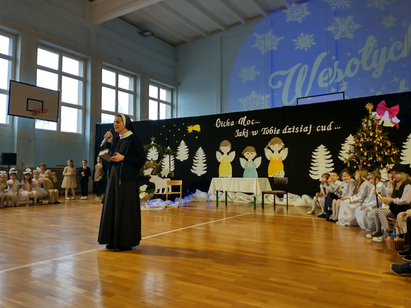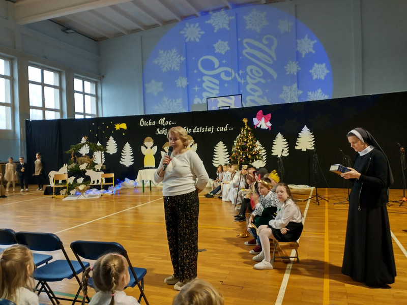 W pierwszej części uroczystości obejrzeliśmy spektakl „Narodziła się miłość” przygotowany przez klasę 2a pod kierunkiem pani Anny Kamyszek i siostry Teresy Kalskiej. Drugoklasiści z dużym zaangażowaniem zaprezentowali historię narodzin Jezusa, wprowadzając publiczność w świąteczny i pełen wzruszeń nastrój. Urozmaiceniem przedstawienia był występ grupy przedszkolnej i wspólne śpiewanie kolęd.