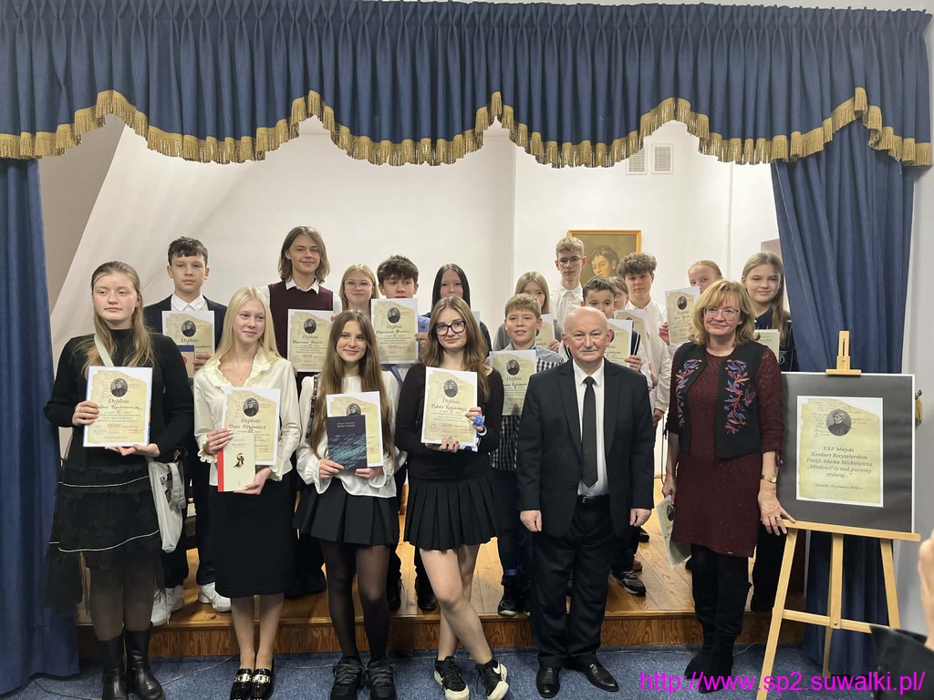 18 grudnia w Bibliotece Publicznej w Suwałkach odbył się XXV Miejski Konkurs Recytatorski Poezji Adama Mickiewicza „Młodości! ty nad poziomy wylatuj…” Z dumą informujemy, że w zaszczytnym gronie laureatów znalazła się uczennica klasy 8a, Natalia Kolesińska, która zachwyciła jurorów swą interpretacją fragmentu ballady pt. „Kurhanek Maryli” i zajęła V miejsce.