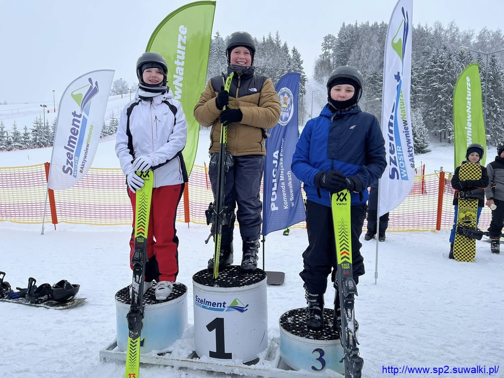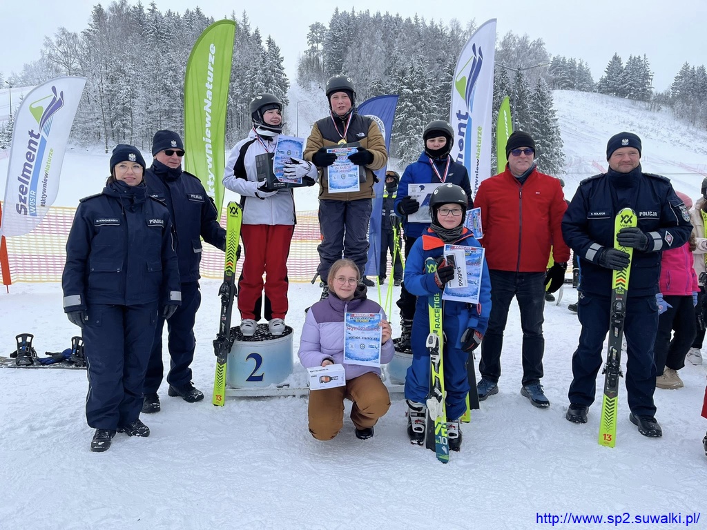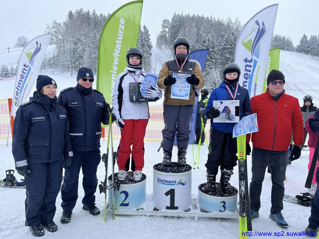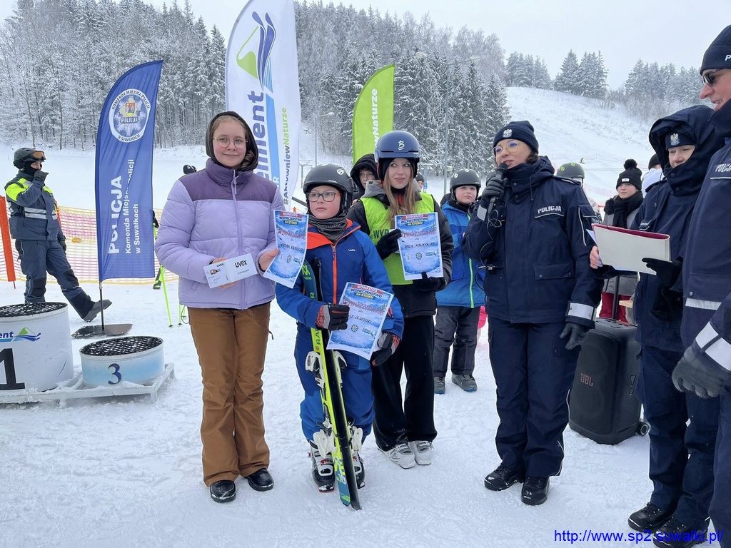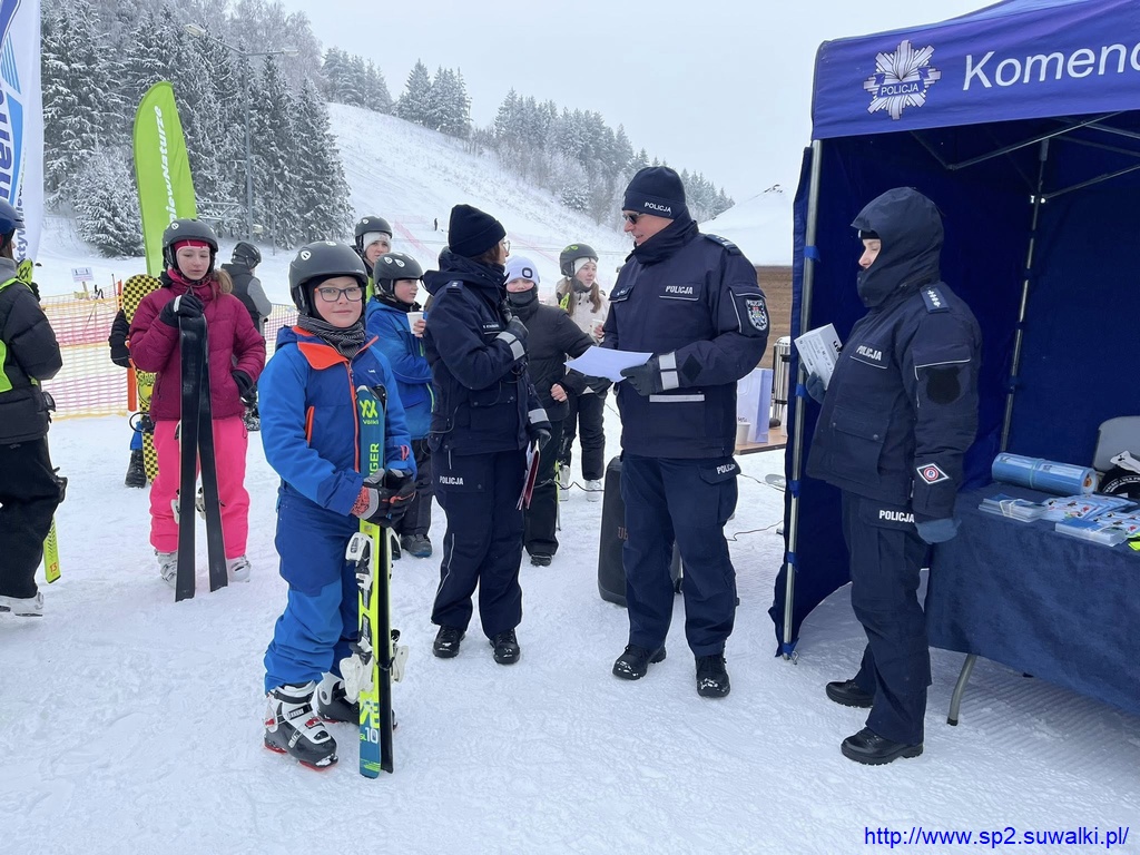 Następnie chętni uczniowie wzięli udział w konkursie narciarskim „Bezpieczeństwo na stoku” zorganizowanym przez Komendę Miejską Policji w Suwałkach. Nasi reprezentanci okazali się bezkonkurencyjni. Atrakcyjne nagrody zdobyli: Bartłomiej Olszewski - I miejsce, Kornelia Kwaśniewska - II miejsce, Krzysztof Naumowicz - III miejsce, oraz Wiktoria Nowikowska i Łukasz Olszewski, którzy otrzymali wyróżnienia. Serdecznie gratulujemy!