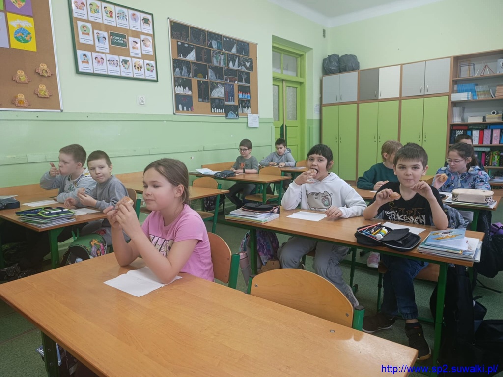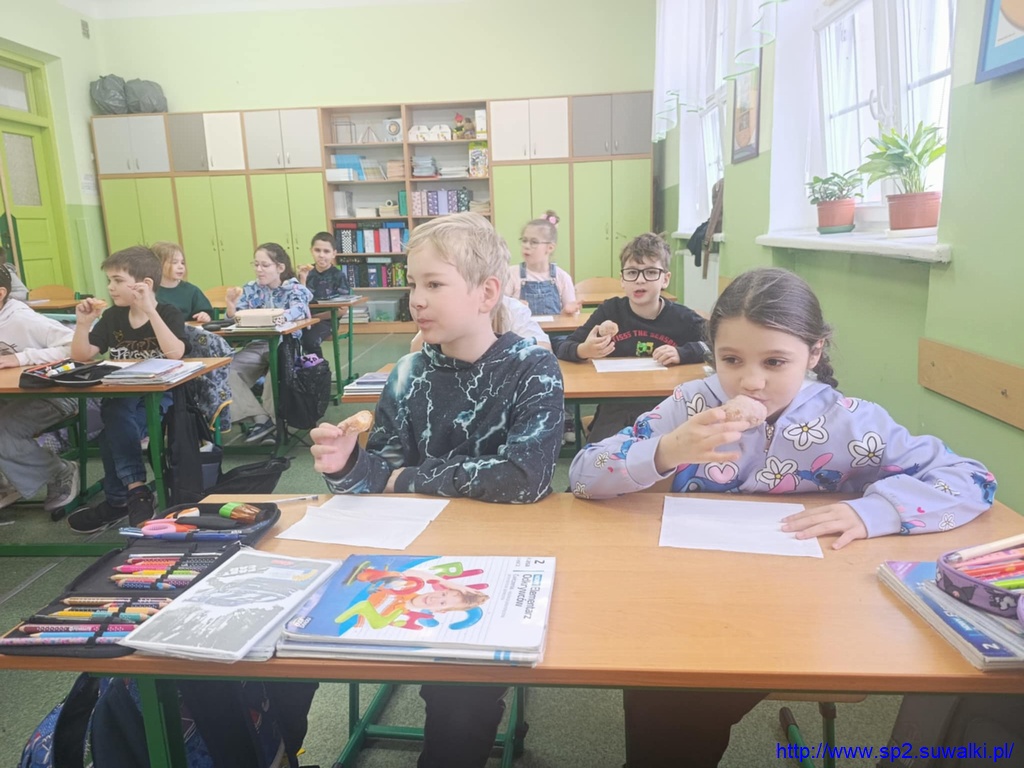 Ostatnie dni karnawału minęły uczniom klasy 2c bardzo wesoło. Oprócz udziału w szkolnym kiermaszu dzieci miały klasowy poczęstunek z okazji tłustego czwartku. To zasługa taty Gabriela Pierożyńskiego, który przyniósł do szkoły pączki własnego wyrobu.
