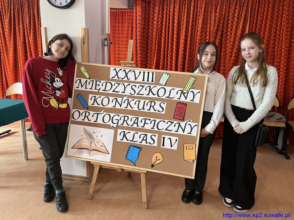 30 marca uczniowie klasy 4a - Witold Czerniecki, Natalia Parafinowicz i Hanna Rutkowska – wzięli udział w XXVIII Międzyszkolnym Konkursie Ortograficznym Klas IV, który został zorganizowany przez SP10 w Suwałkach. Z radością informujemy, że Witek zajął w nim 3. miejsce.