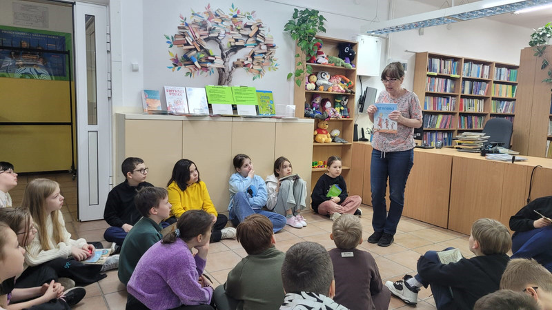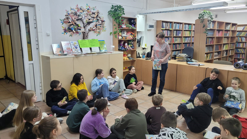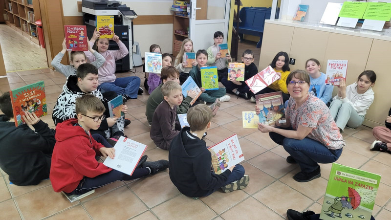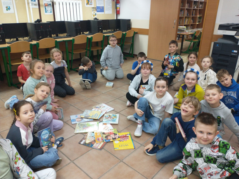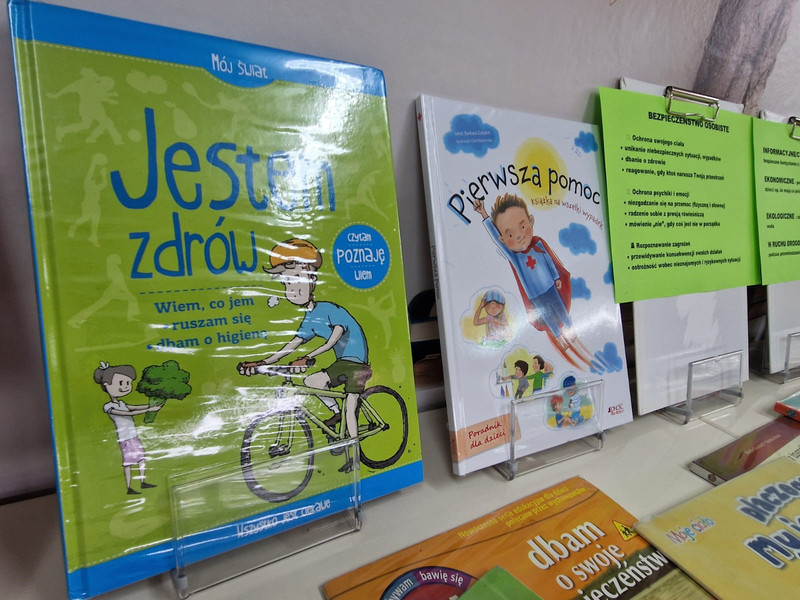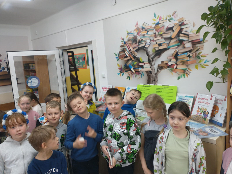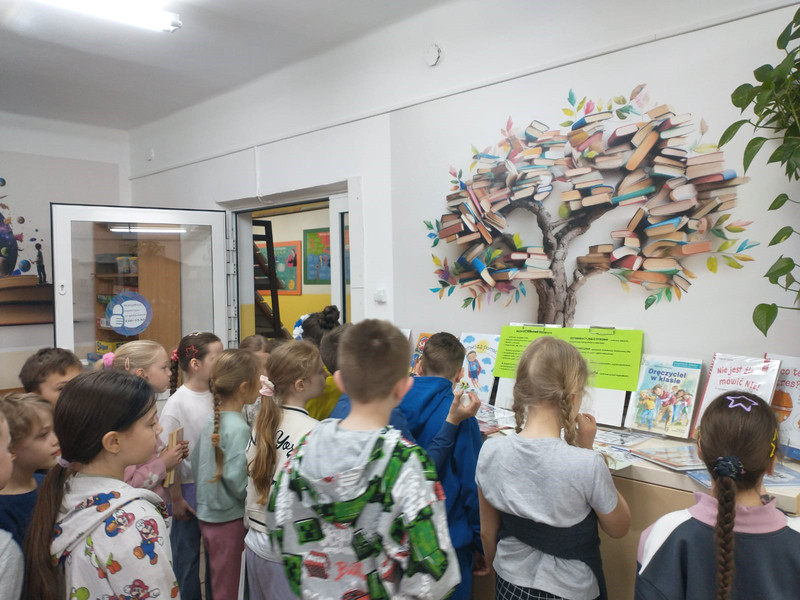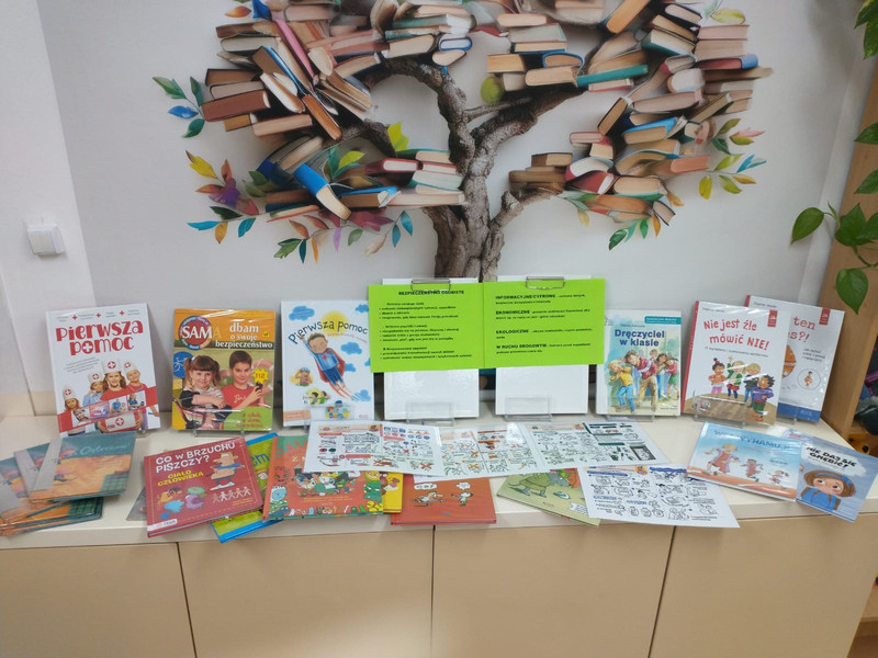 W szkolnej bibliotece na dzieci czekała specjalnie przygotowana wystawka książek poświęconych tematyce bezpieczeństwa. Pani bibliotekarka opowiadała uczniom klas 1–3 o prezentowanych publikacjach, przybliżając im ważne zasady bezpiecznego zachowania w różnych sytuacjach.