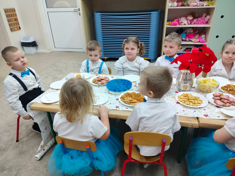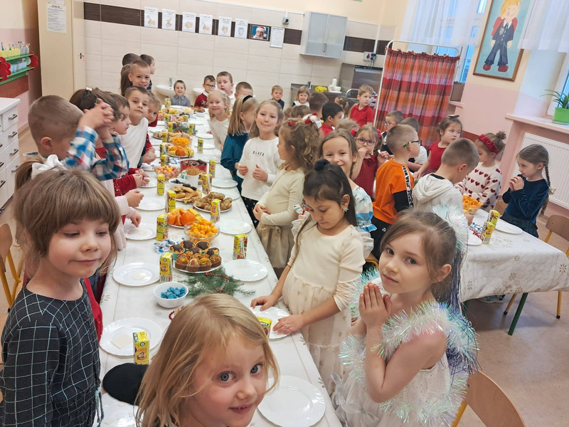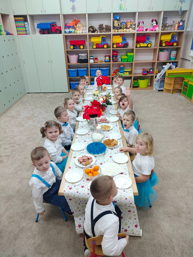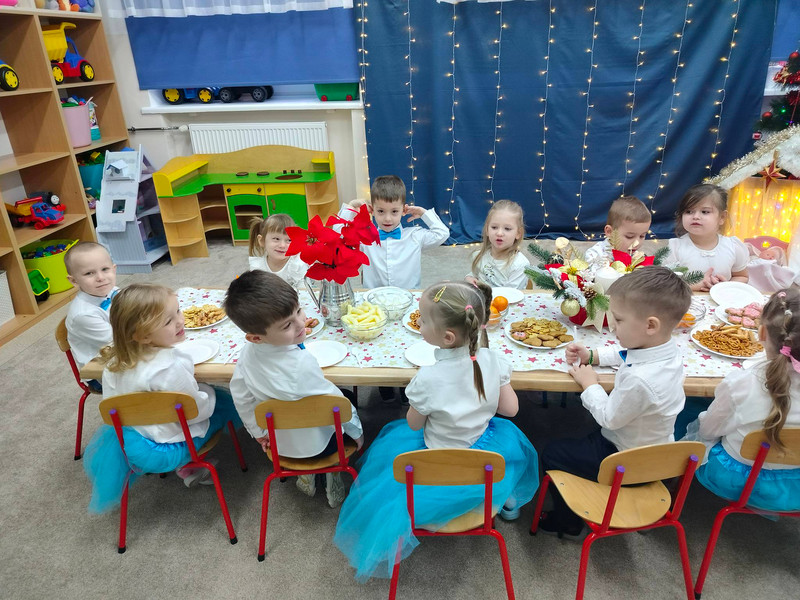 W dzień przedszkolnej wigilii panowała radosna, ożywiona atmosfera. Świąteczne dekoracje oraz dzieci w galowych strojach wprowadzały nastrój oczekiwania na wyjątkowe, niecodzienne wydarzenie. Uroczystość rozpoczęły wspólne życzenia i kolędowanie. Na stole pojawiły się przysmaki, które wspólnie zostały skonsumowane. Nie zabrakło również prezentów, które dzieci znalazły pod choinką.