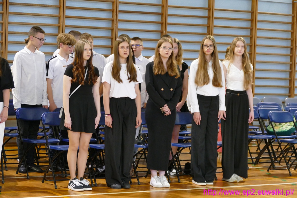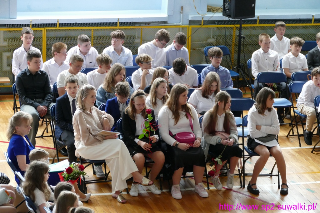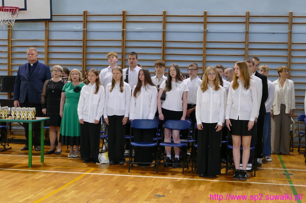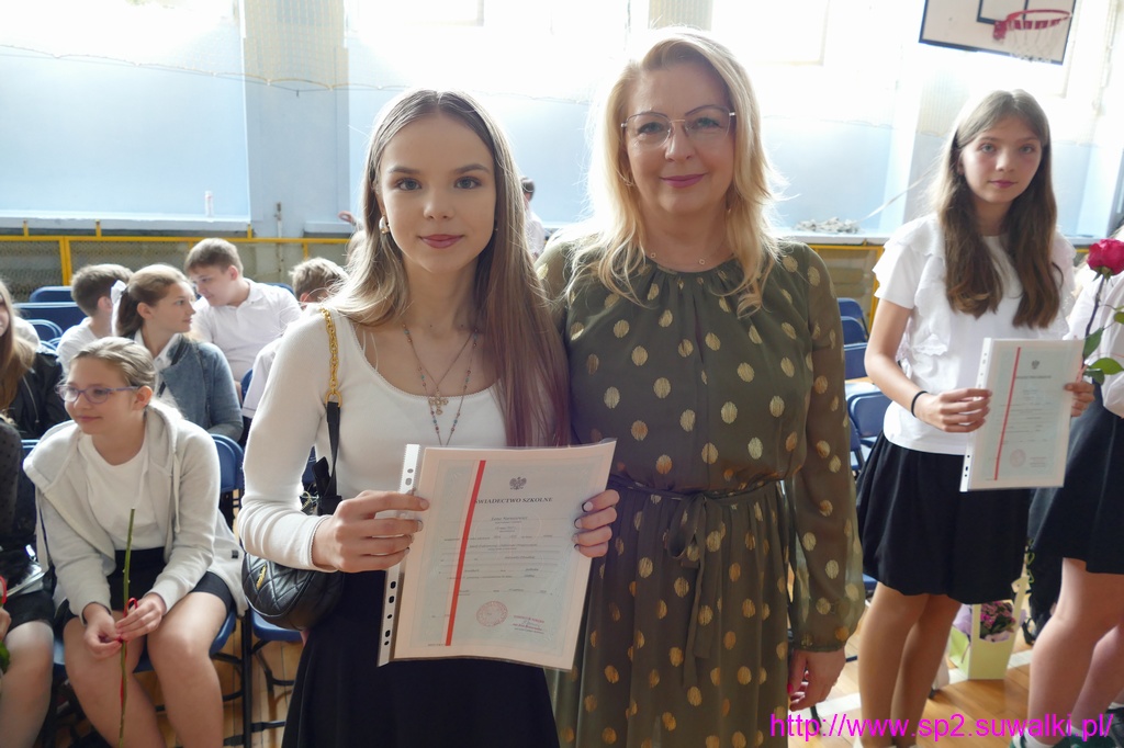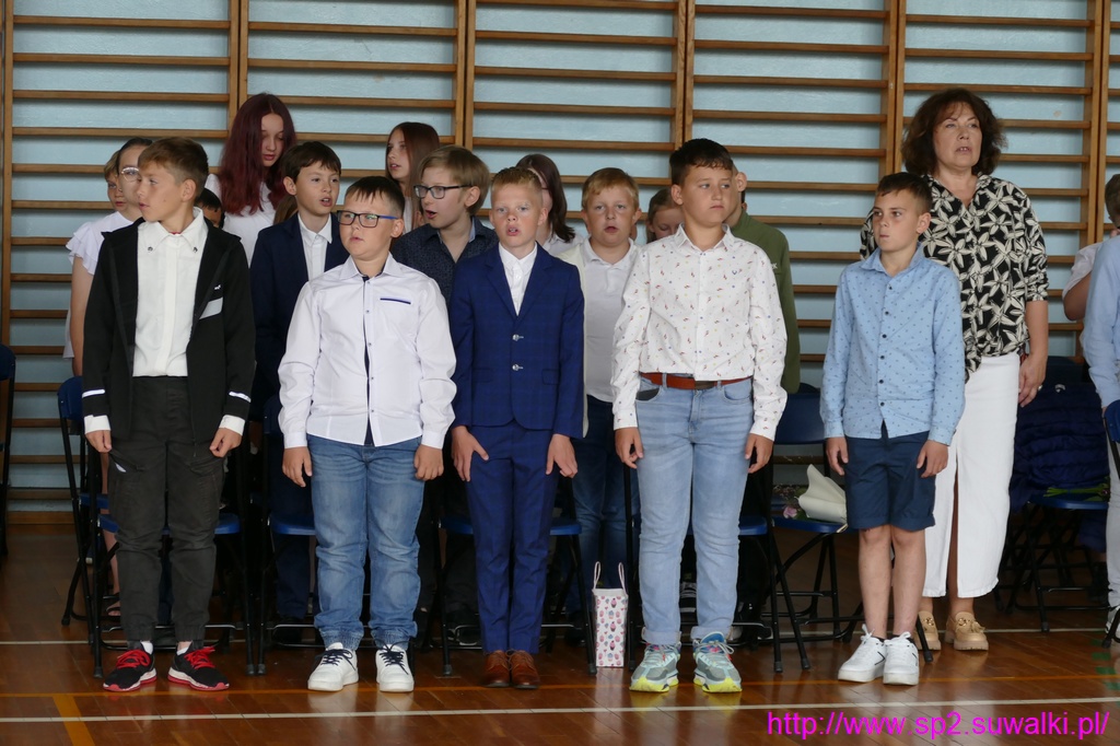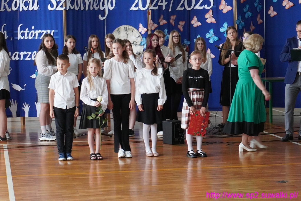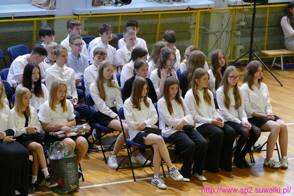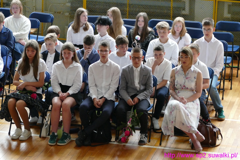 Niezwykle wzruszającym momentem było pożegnanie tegorocznych ósmoklasistów, którzy zakończyli swoją przygodę w suwalskiej „dwójce”. Najbardziej zaangażowani w życie szkoły absolwenci odebrali z rąk pani dyrektor Ewy Brzozowskiej specjalne statuetki, dyplomy i upominki jako dowód wdzięczności za ich pracę i postawę.