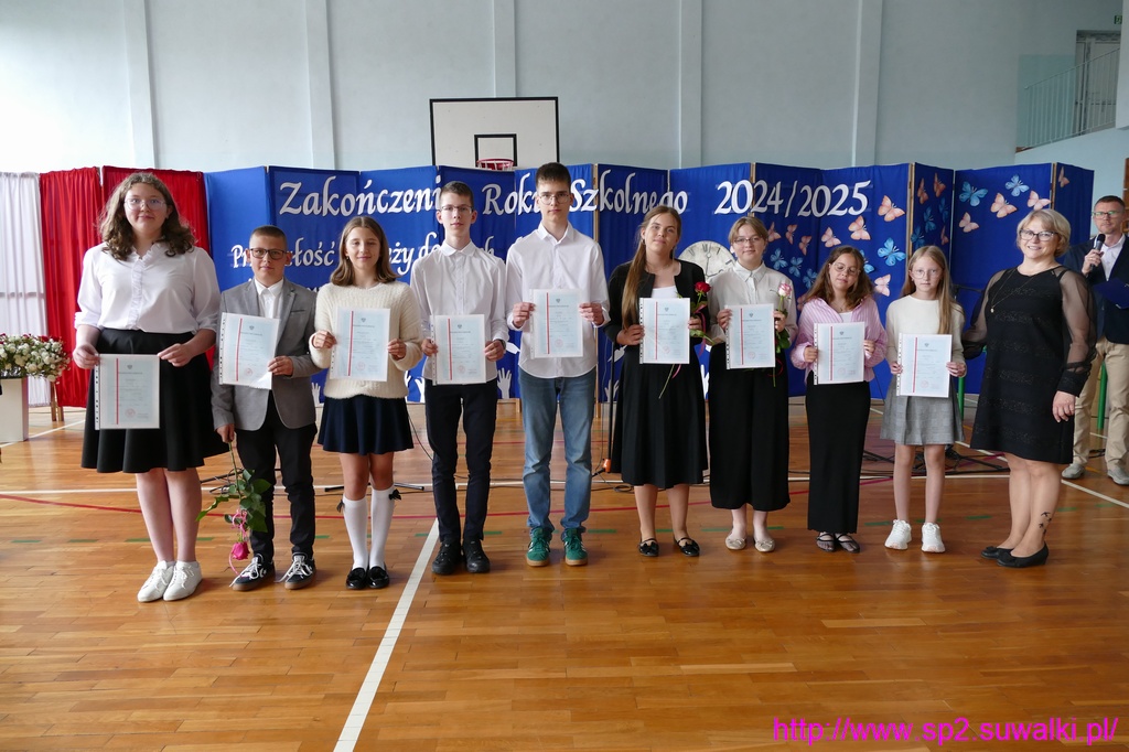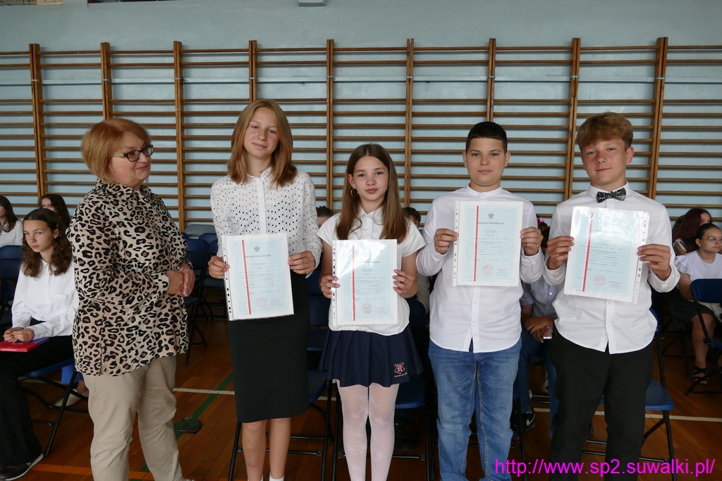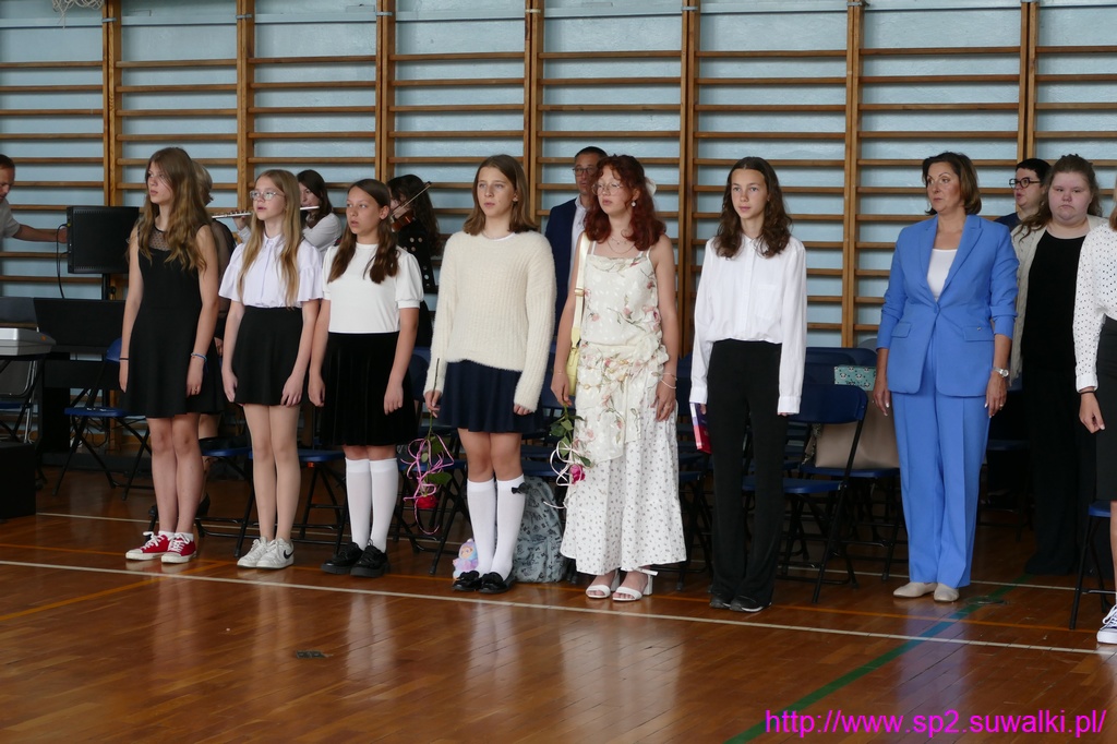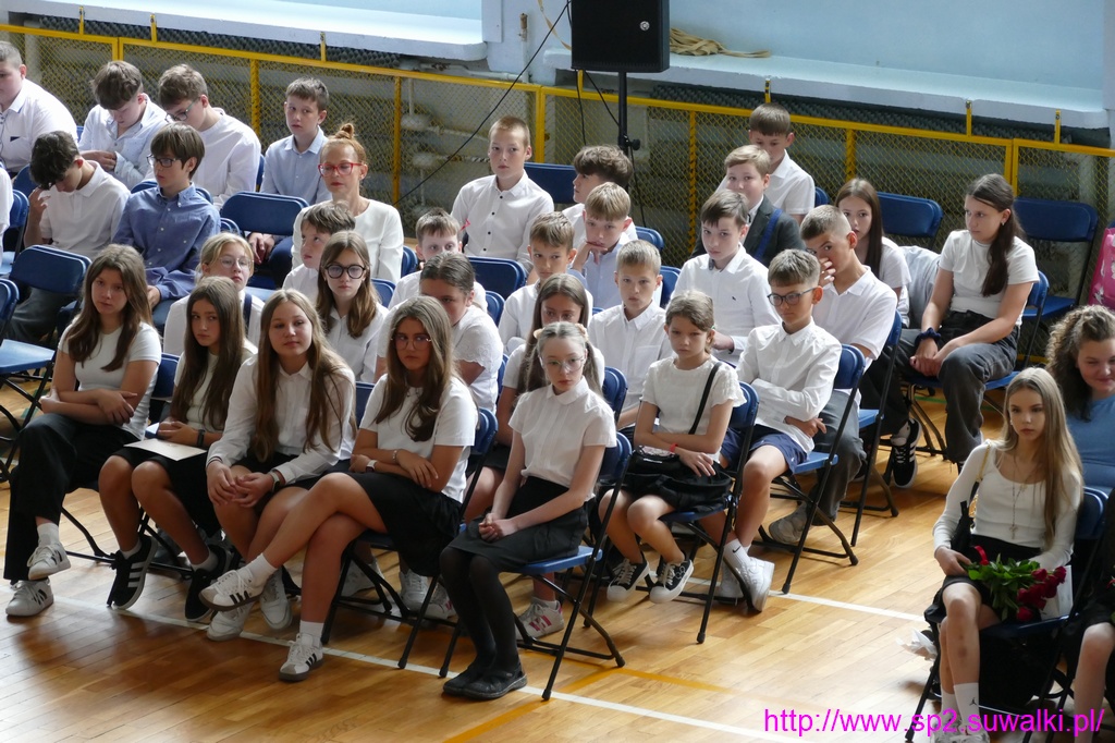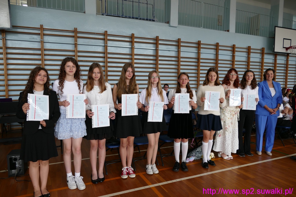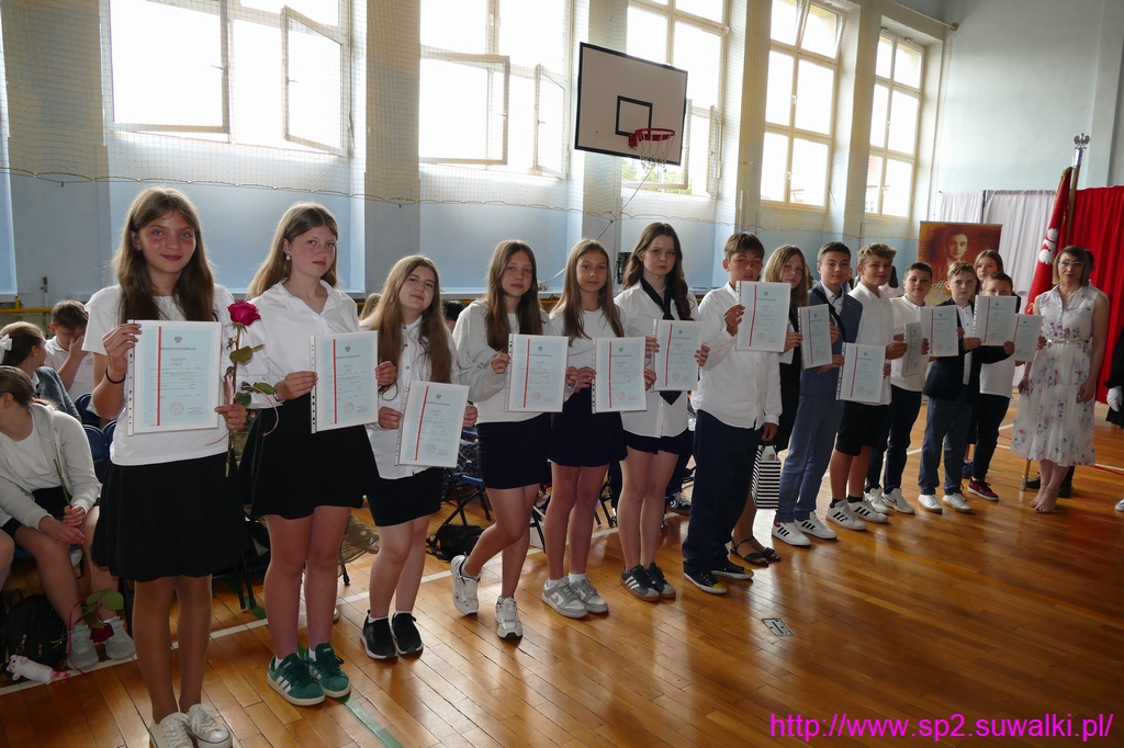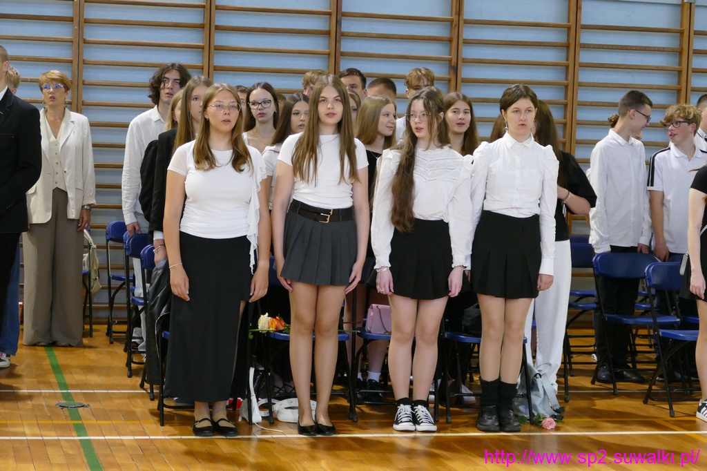 Niezwykle wzruszającym momentem było pożegnanie tegorocznych ósmoklasistów, którzy zakończyli swoją przygodę w suwalskiej „dwójce”. Najbardziej zaangażowani w życie szkoły absolwenci odebrali z rąk pani dyrektor Ewy Brzozowskiej specjalne statuetki, dyplomy i upominki jako dowód wdzięczności za ich pracę i postawę.