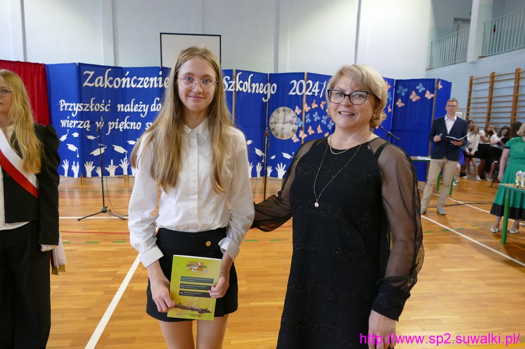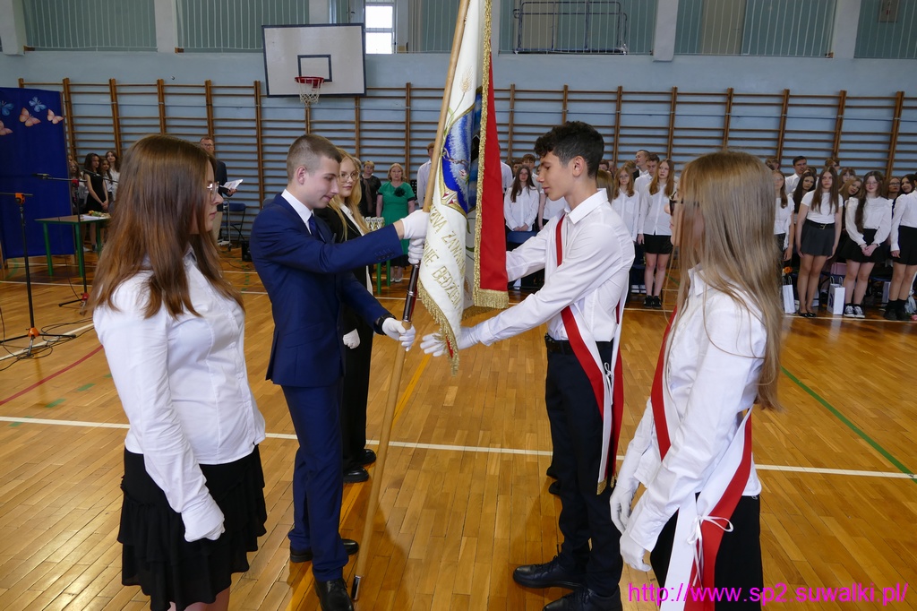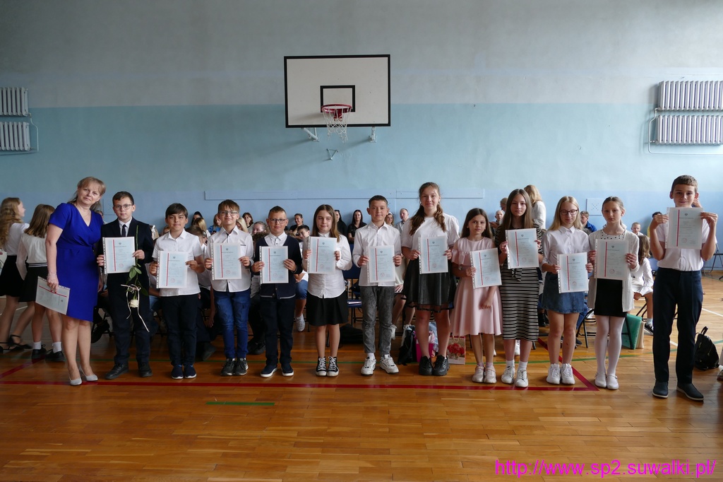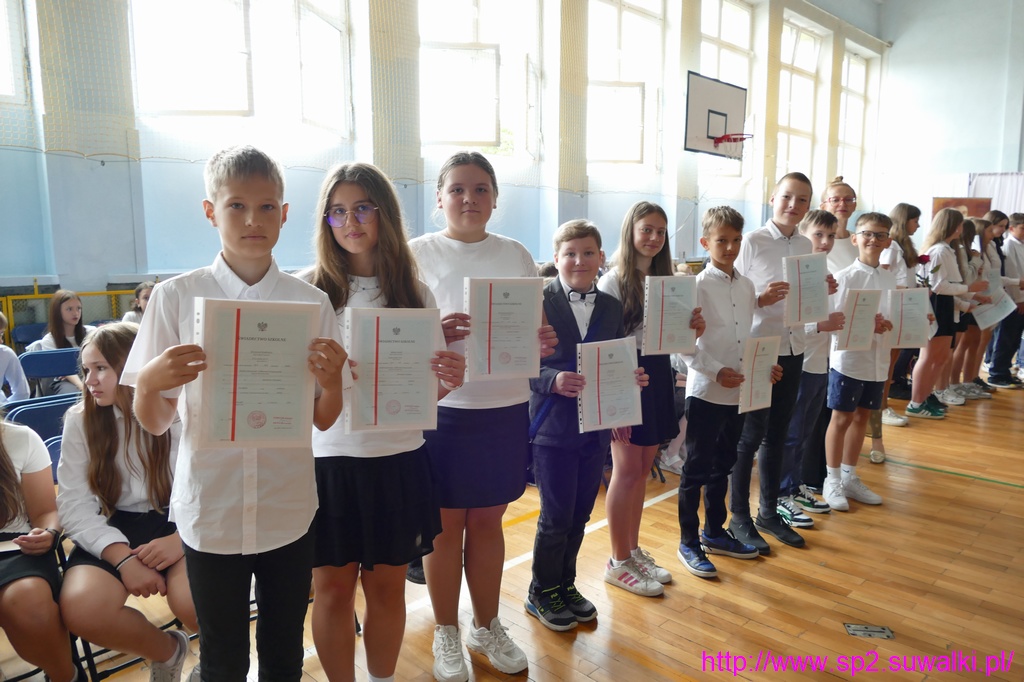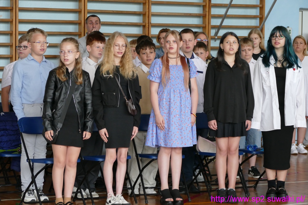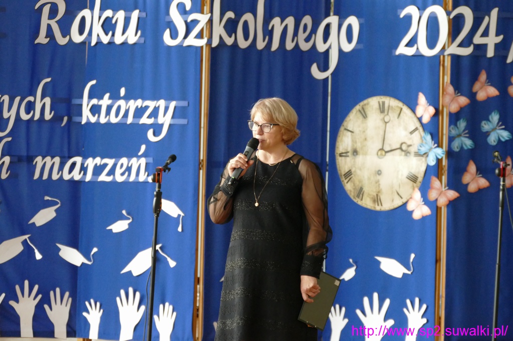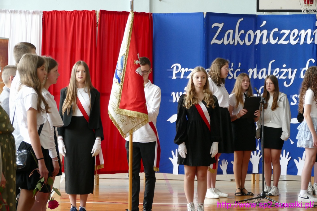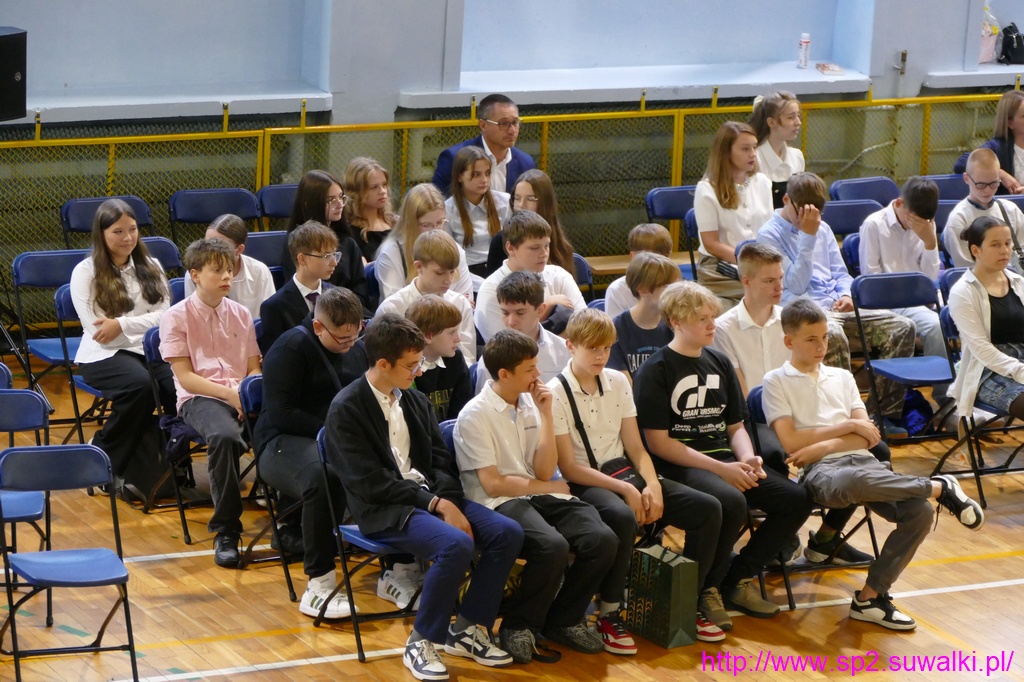Niezwykle wzruszającym momentem było pożegnanie tegorocznych ósmoklasistów, którzy zakończyli swoją przygodę w suwalskiej „dwójce”. Najbardziej zaangażowani w życie szkoły absolwenci odebrali z rąk pani dyrektor Ewy Brzozowskiej specjalne statuetki, dyplomy i upominki jako dowód wdzięczności za ich pracę i postawę.