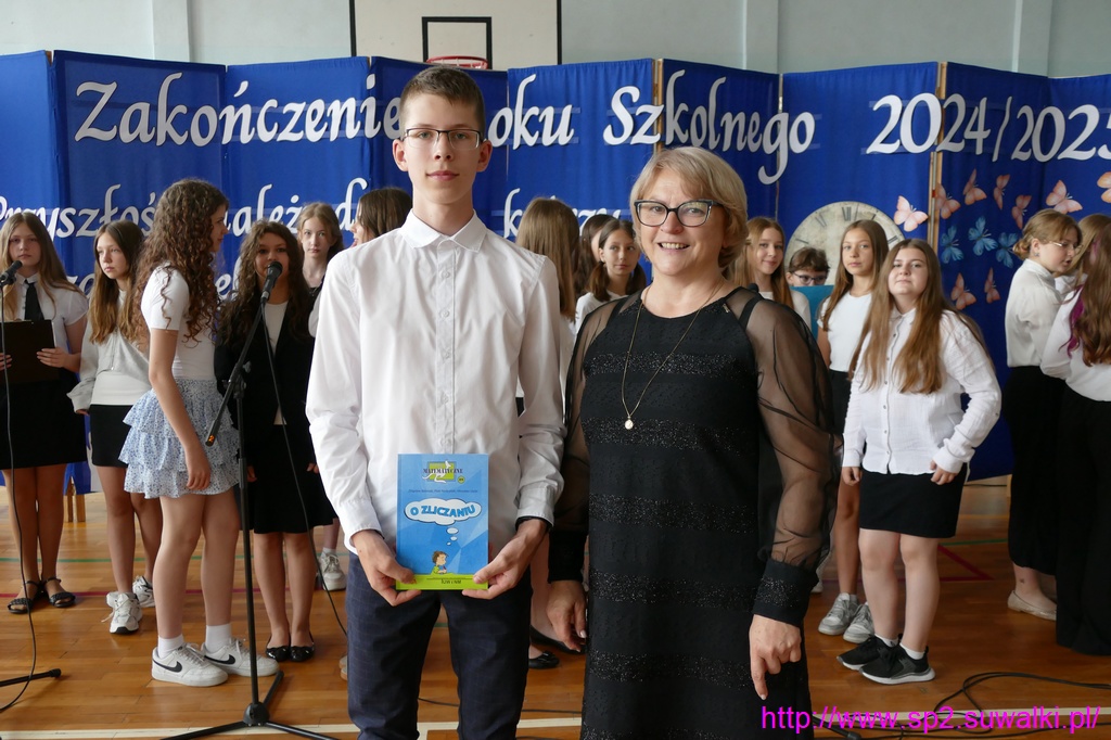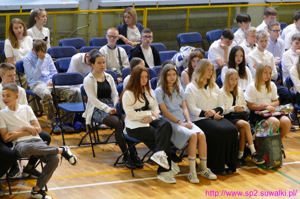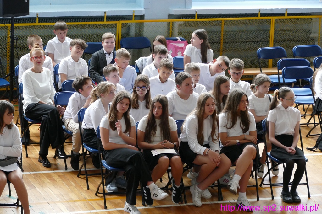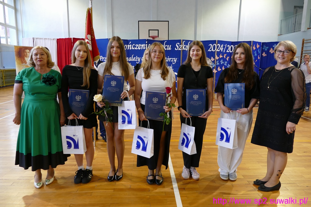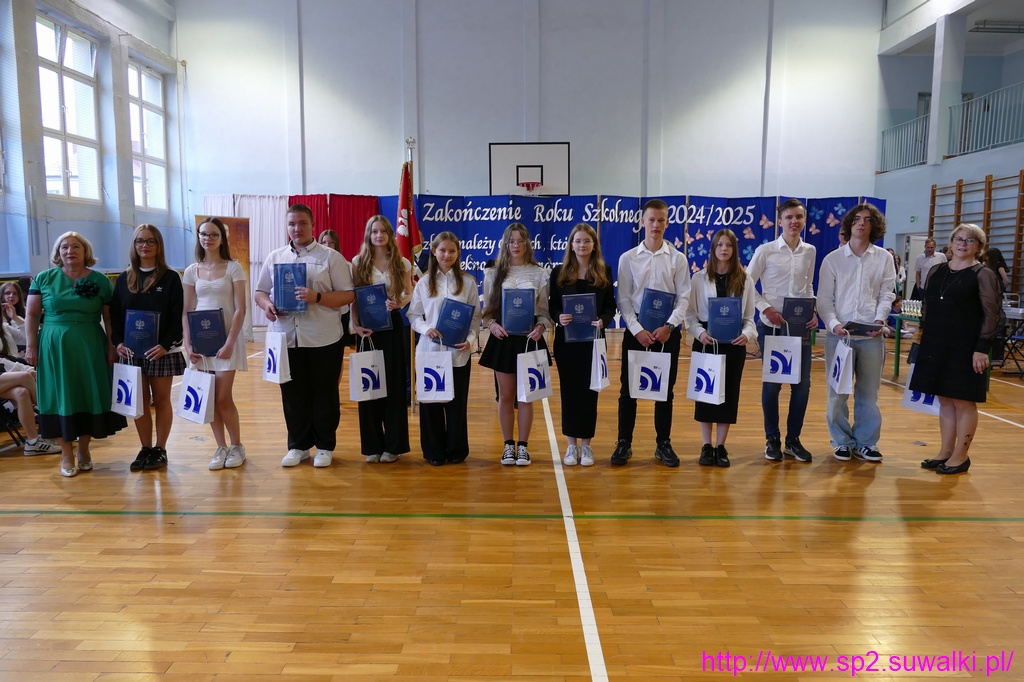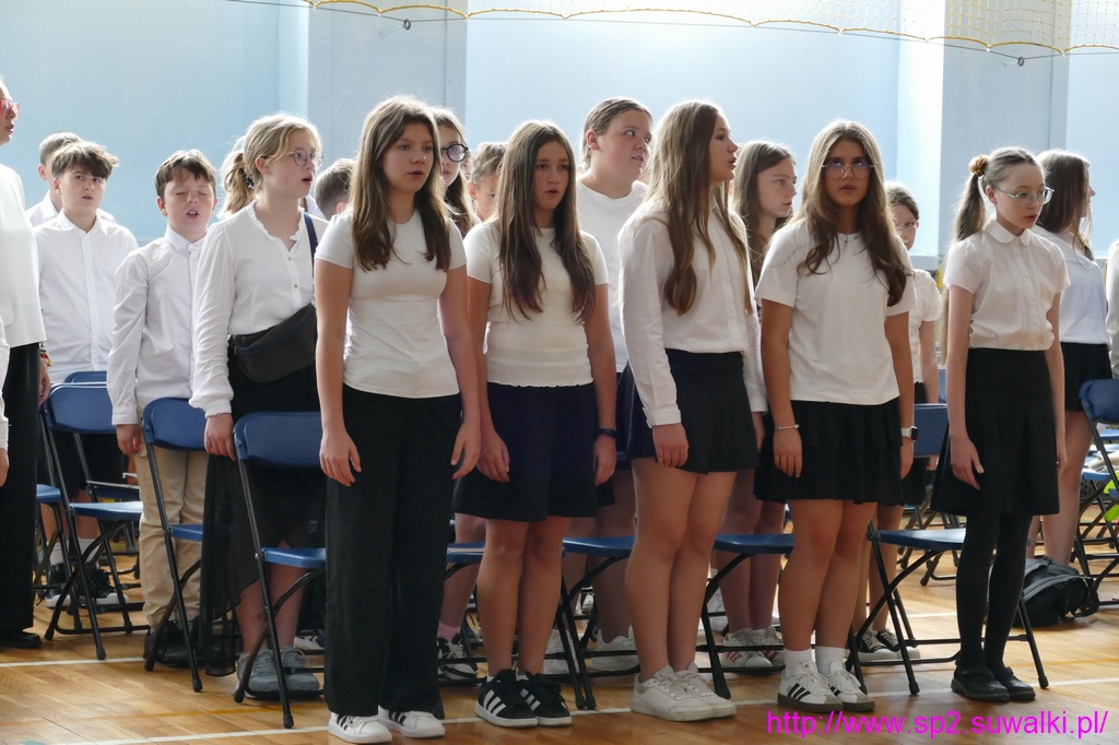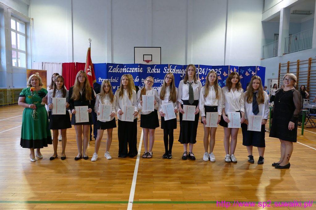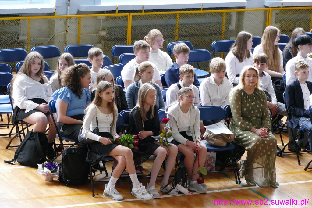 Niezwykle wzruszającym momentem było pożegnanie tegorocznych ósmoklasistów, którzy zakończyli swoją przygodę w suwalskiej „dwójce”. Najbardziej zaangażowani w życie szkoły absolwenci odebrali z rąk pani dyrektor Ewy Brzozowskiej specjalne statuetki, dyplomy i upominki jako dowód wdzięczności za ich pracę i postawę.