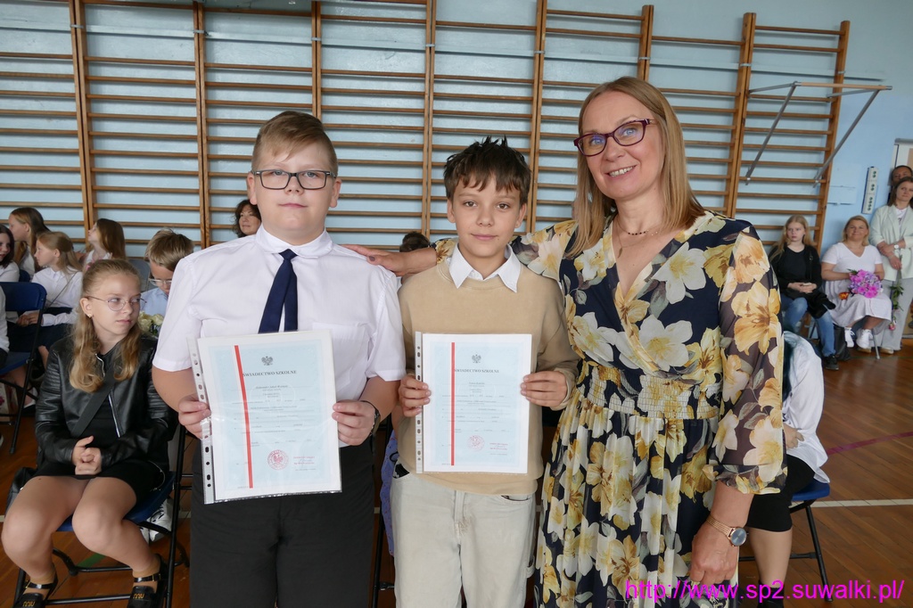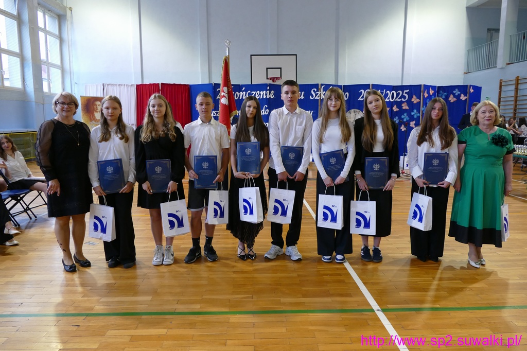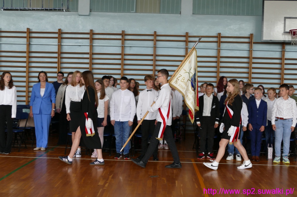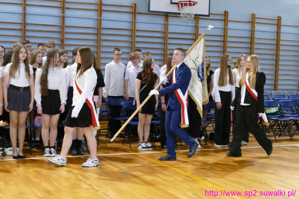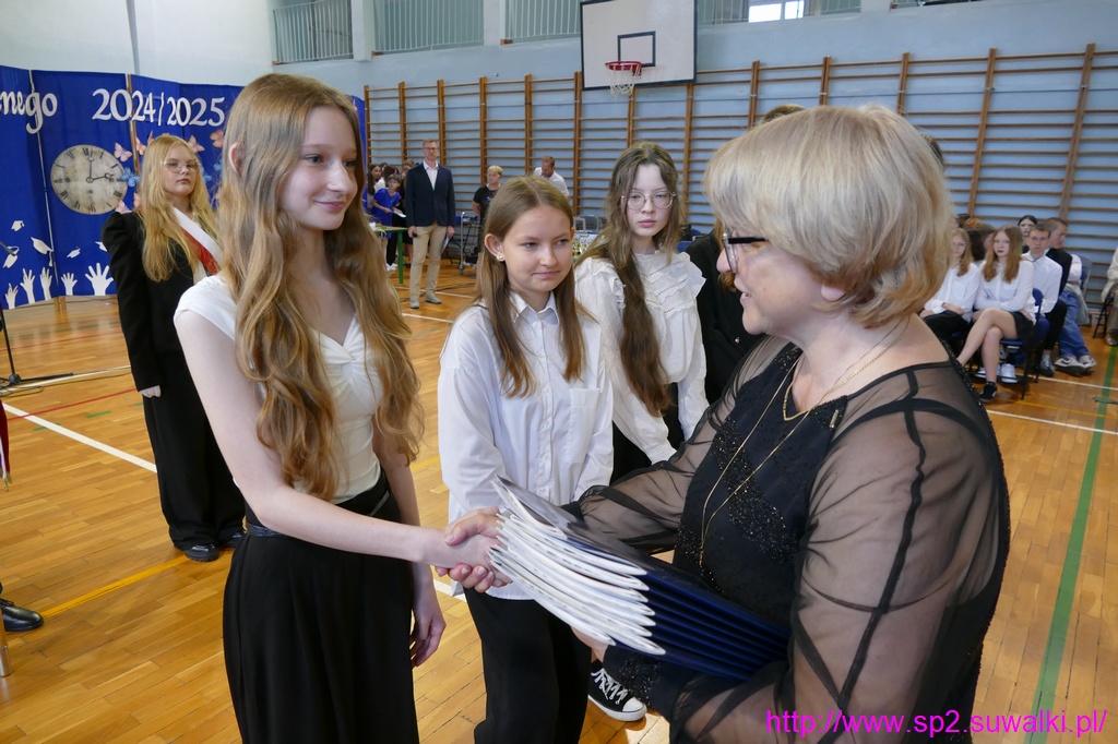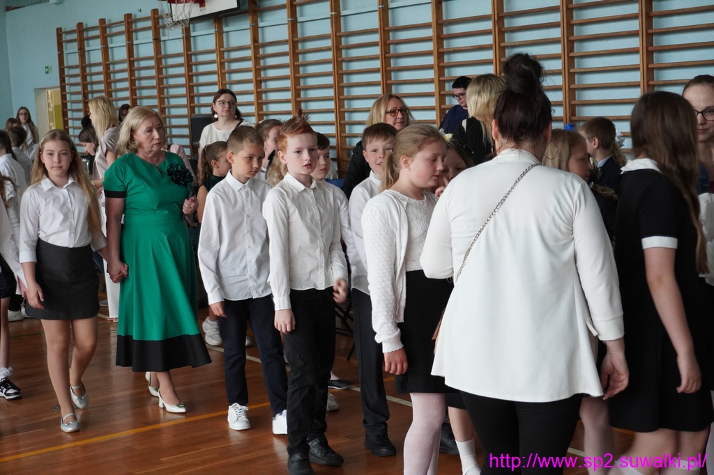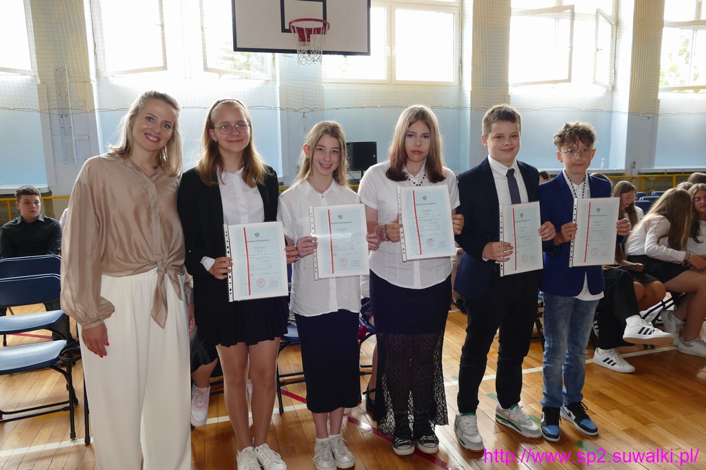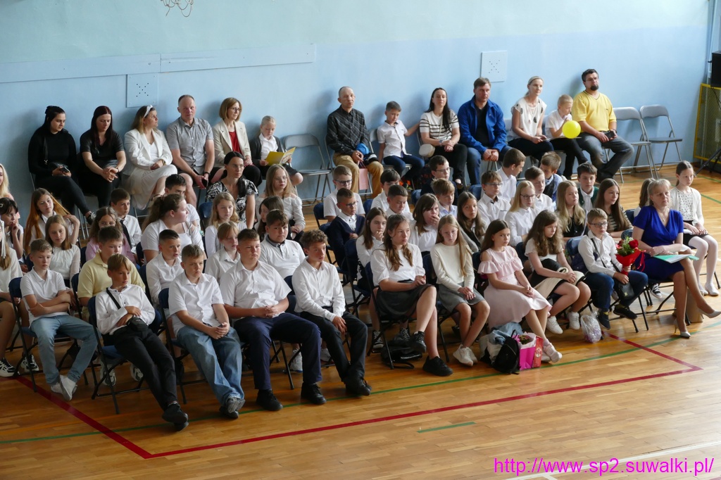 Niezwykle wzruszającym momentem było pożegnanie tegorocznych ósmoklasistów, którzy zakończyli swoją przygodę w suwalskiej „dwójce”. Najbardziej zaangażowani w życie szkoły absolwenci odebrali z rąk pani dyrektor Ewy Brzozowskiej specjalne statuetki, dyplomy i upominki jako dowód wdzięczności za ich pracę i postawę.