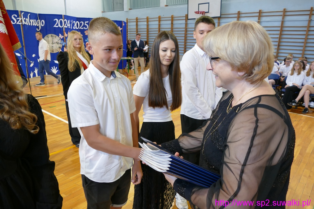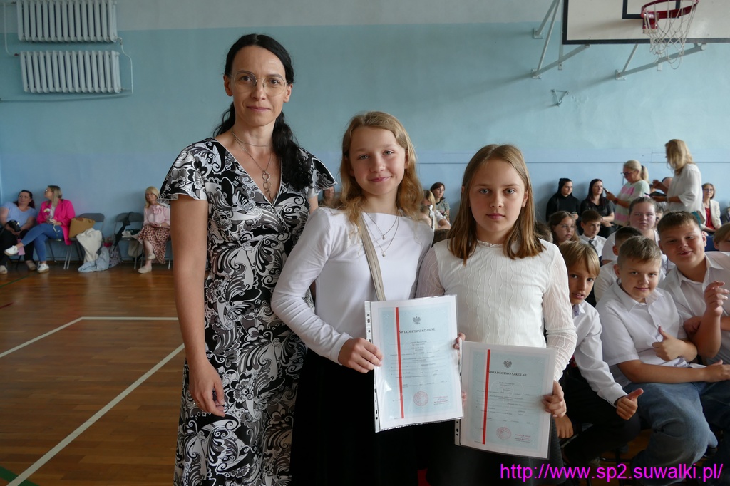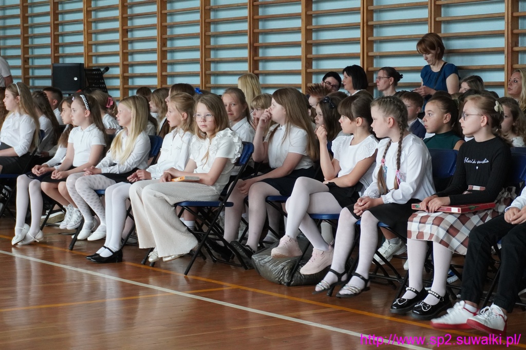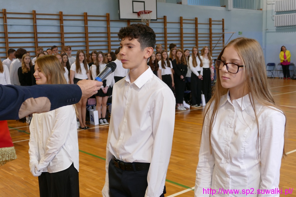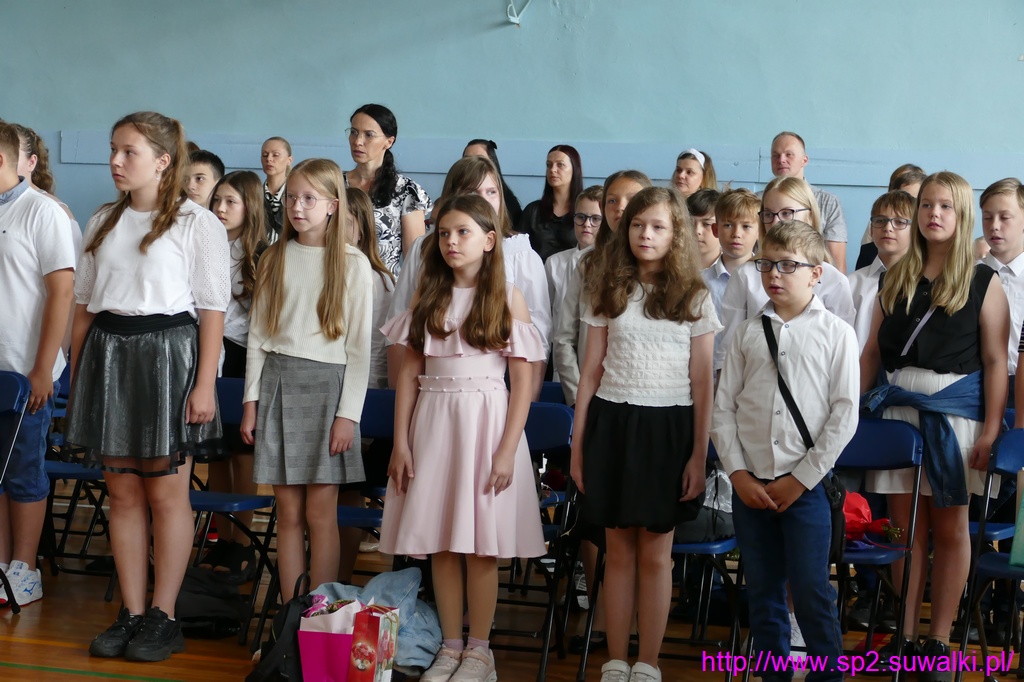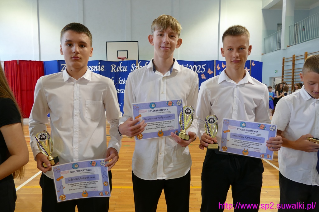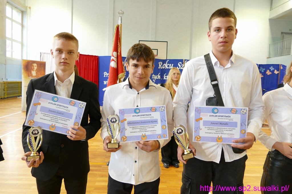 Niezwykle wzruszającym momentem było pożegnanie tegorocznych ósmoklasistów, którzy zakończyli swoją przygodę w suwalskiej „dwójce”. Najbardziej zaangażowani w życie szkoły absolwenci odebrali z rąk pani dyrektor Ewy Brzozowskiej specjalne statuetki, dyplomy i upominki jako dowód wdzięczności za ich pracę i postawę.