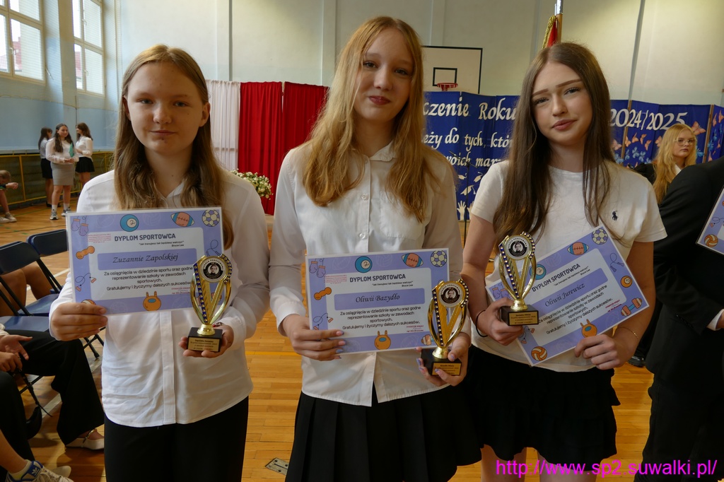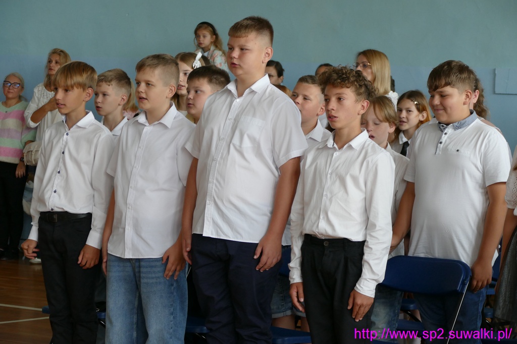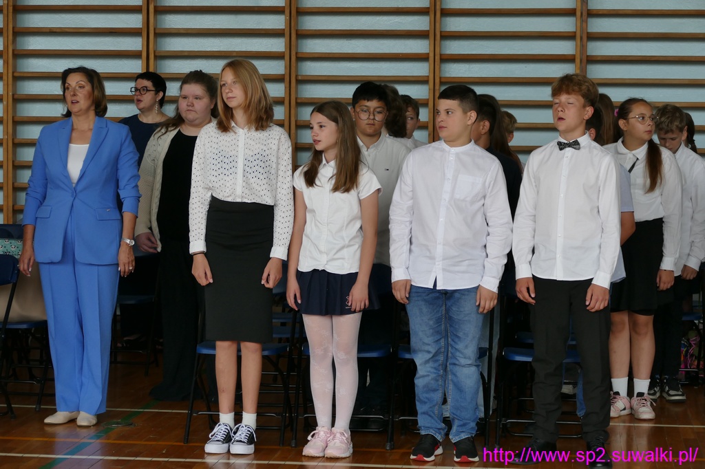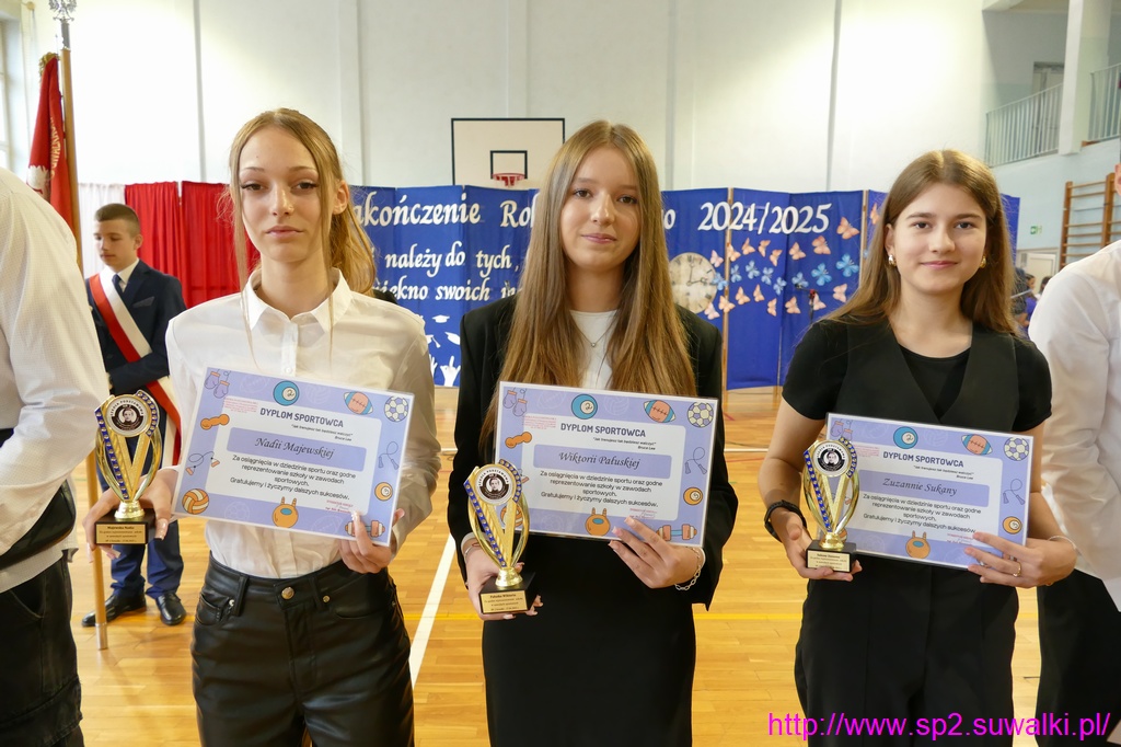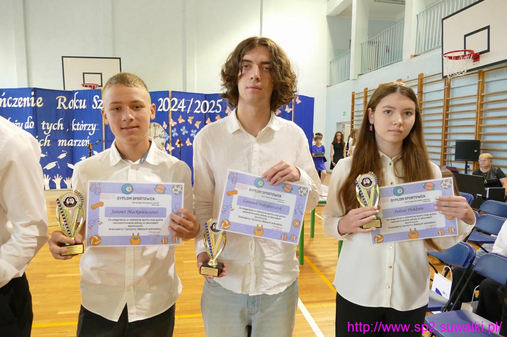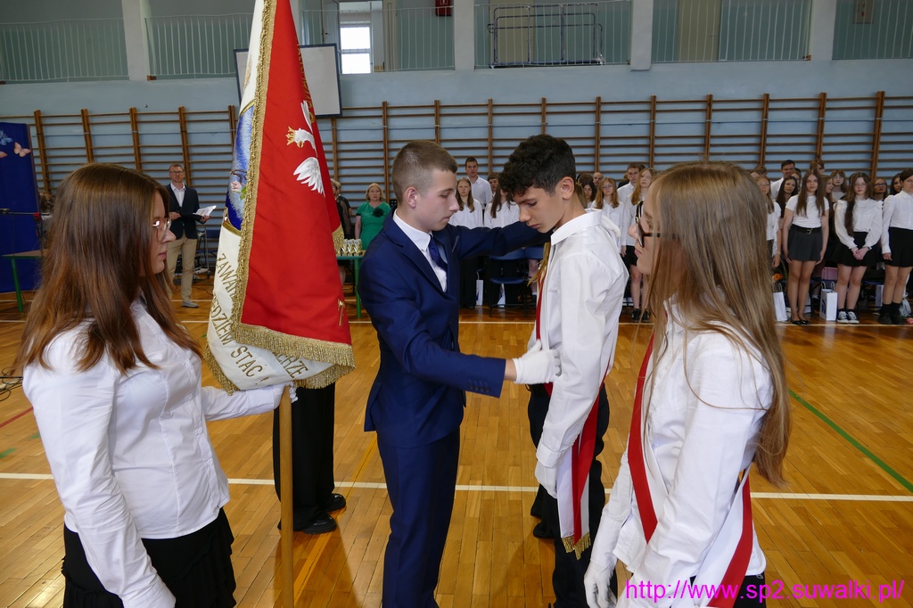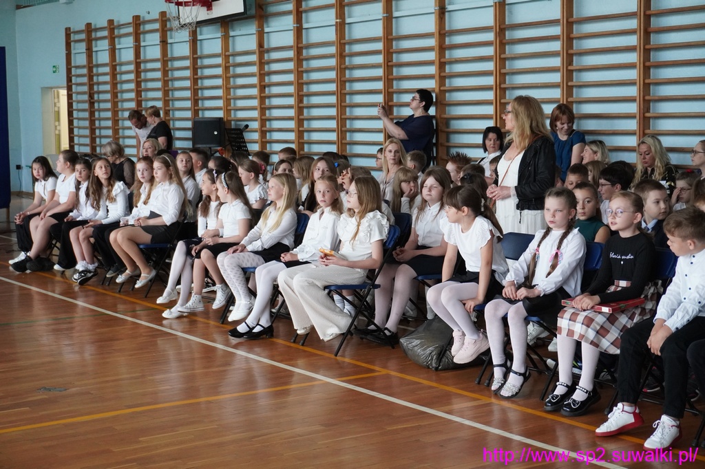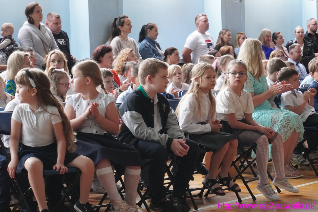 Niezwykle wzruszającym momentem było pożegnanie tegorocznych ósmoklasistów, którzy zakończyli swoją przygodę w suwalskiej „dwójce”. Najbardziej zaangażowani w życie szkoły absolwenci odebrali z rąk pani dyrektor Ewy Brzozowskiej specjalne statuetki, dyplomy i upominki jako dowód wdzięczności za ich pracę i postawę.