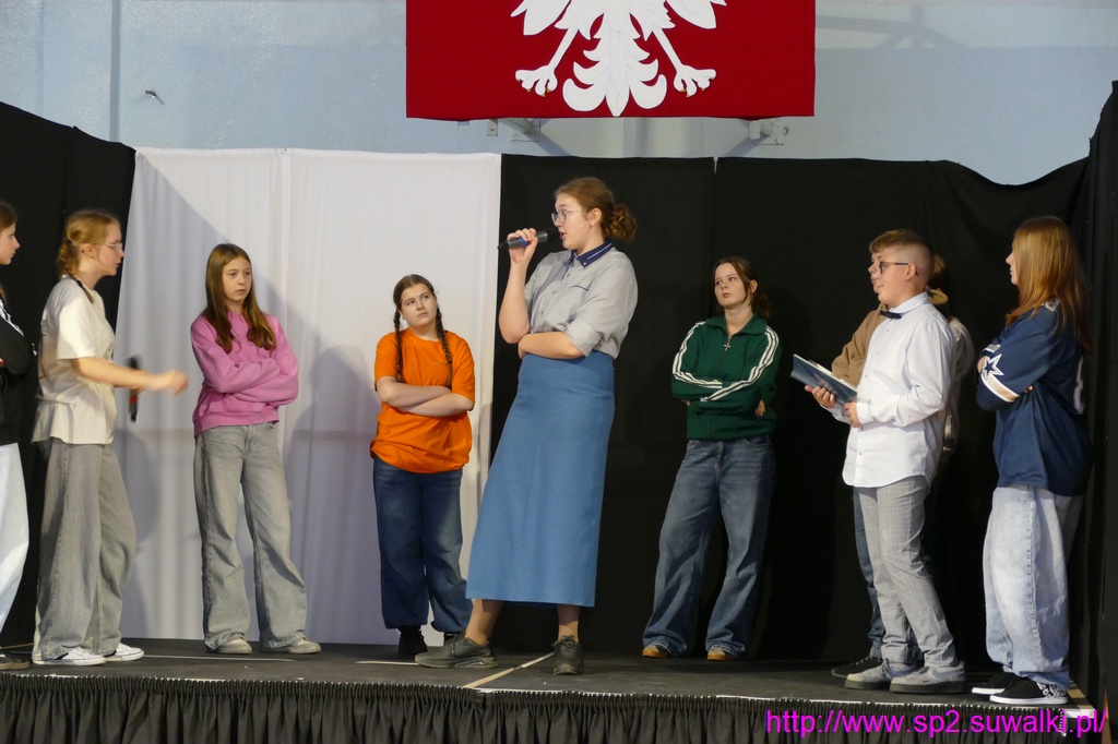 Następnie obejrzeliśmy inscenizację przygotowaną przez uczniów klasy 7a pod kierunkiem pani Małgorzaty Kuszel. Spektakl rozpoczął się od sceny z grupą współczesnej młodzieży, której beztroska postawa stała się punktem wyjścia do refleksji nad tym, jak łatwo zapomnieć o przeszłości i jak ważne jest, by pamięć o niej trwała.