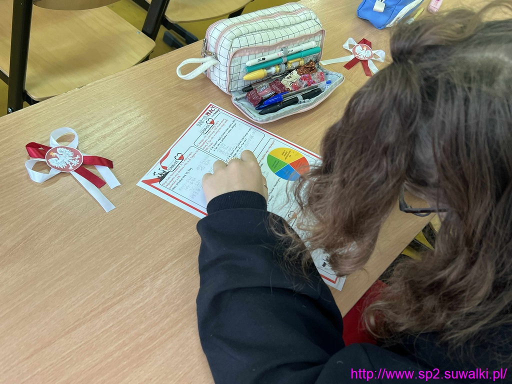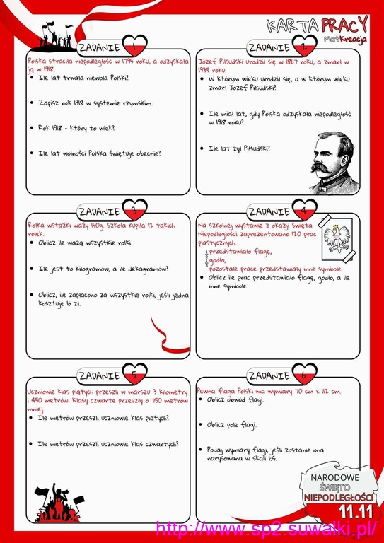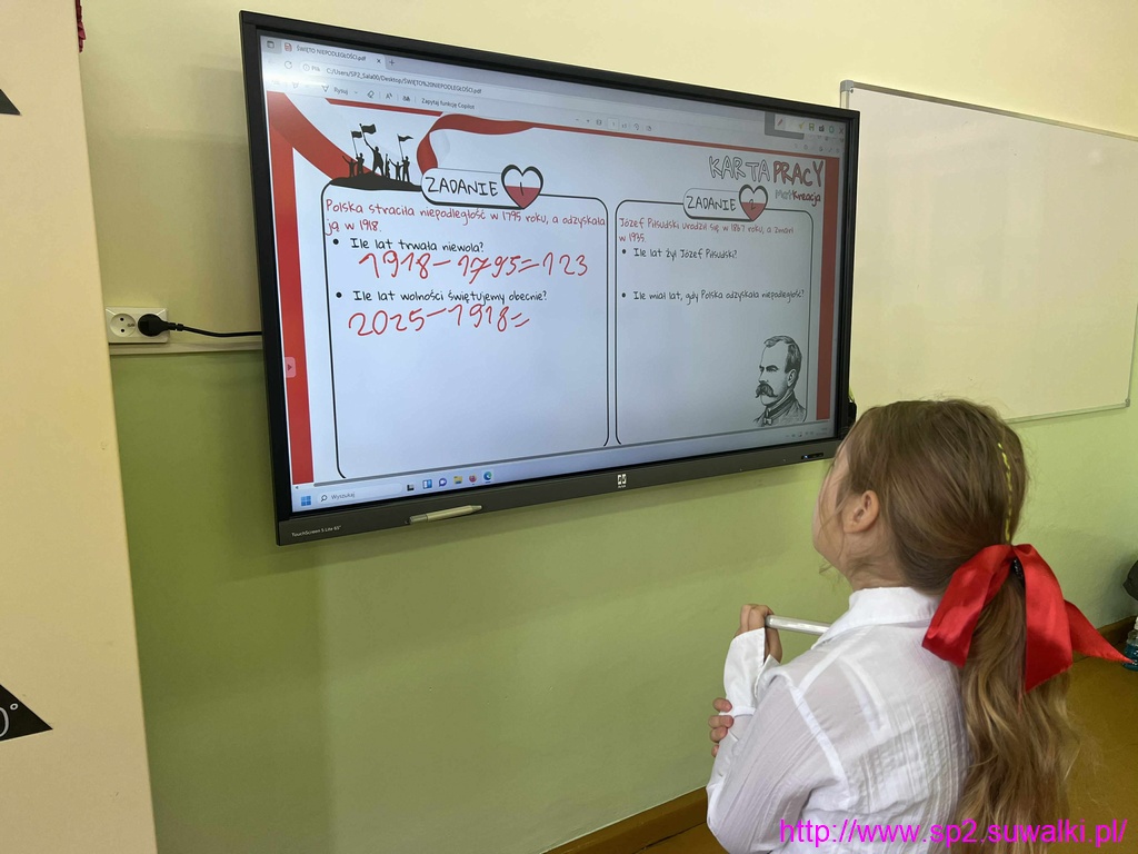 Klasy czwarte obliczały, ile lat trwała niewola oraz ile lat wolnej Polski obecnie świętujemy. Klasy piąte sprawdzały, ile lat miał Józef Piłsudski w chwili odzyskania przez Polskę niepodległości. Klasa 6d rozwiązywała zadania z prędkości, drogi i czasu nawiązujące do wydarzeń z 11 listopada. Klasa 7a zajmowała się zadaniami z procentami o tematyce patriotycznej. Uczniowie klasy ósmej rozwiązywali zadania utrzymane w duchu Święta Niepodległości, które jednocześnie stanowiły świetne przygotowanie do egzaminu ósmoklasisty.
